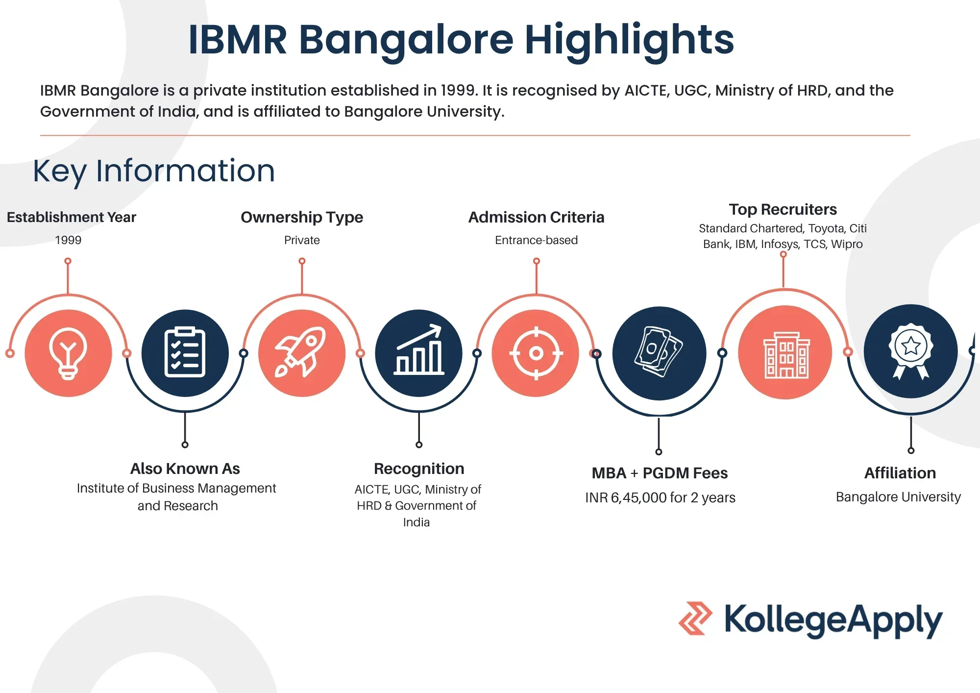 IBMR Bangalore provides all facilities like a library with national and international resources, a fully Wi-Fi-enabled campus, digital classrooms, and sports facilities, along with other amenities. It offers courses like MBA+PGDM and MCA+PGPIT. Admissions are based on entrance exams, such as CAT, MAT, XAT, ATMA, PGCET and KMAT, followed by a Group Discussion (GD) and a Personal Interview (PI).The fees for the MBA+PGDM course is INR 6,45,750 for two years. IBMR Bangalore also maintains a strong placement record. For the 2024 batch, the highest package offered was INR 9 LPA.