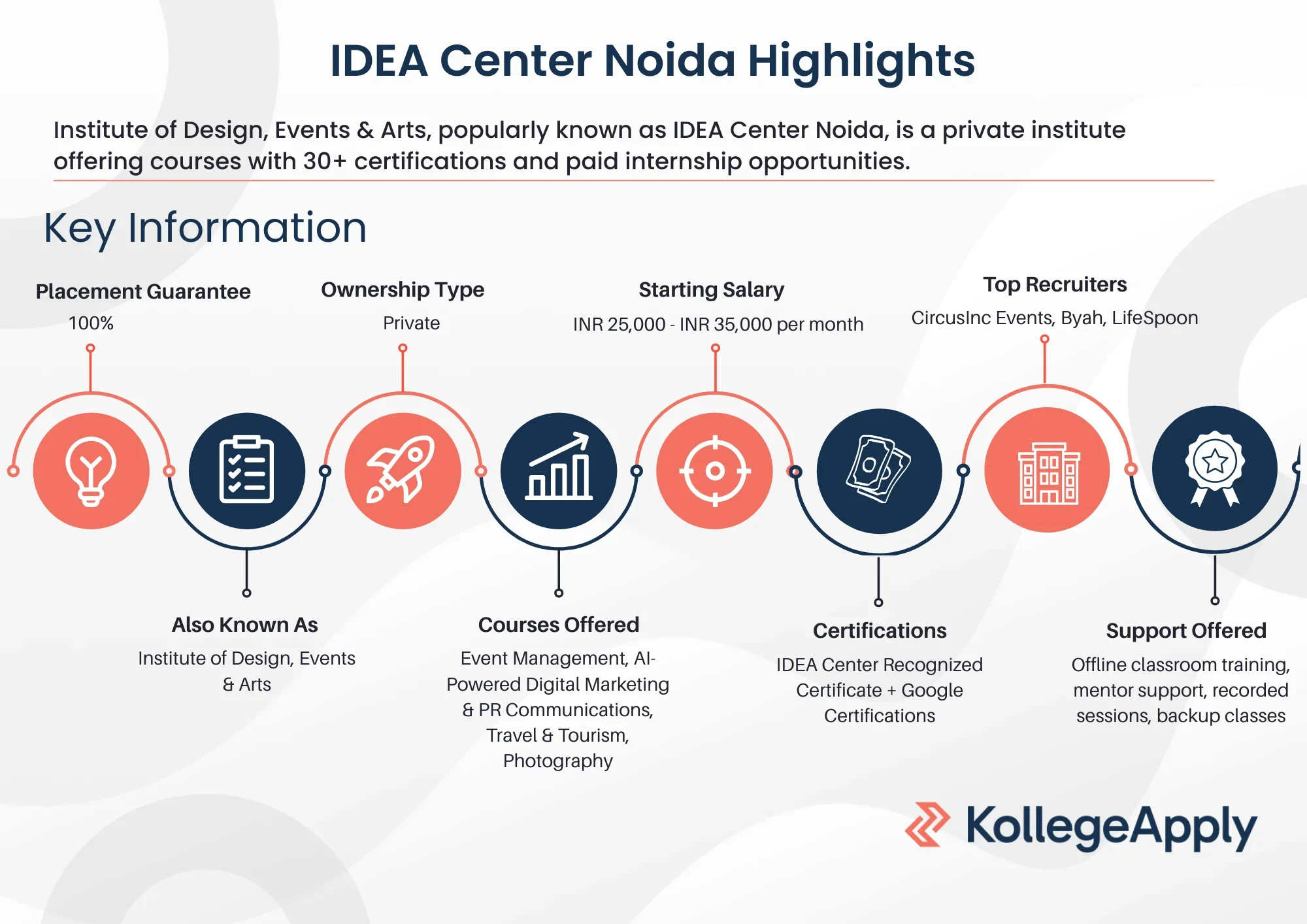 IDEA Center Noida provides a 100% job guarantee to the students. The salary package for freshers ranges between INR 25,000 - INR 35,000 per month. Corporate tie-ups include CircusInc Events, Byah, LifeSpoon, MOP, Global Growth Forum and Brand Impressions.