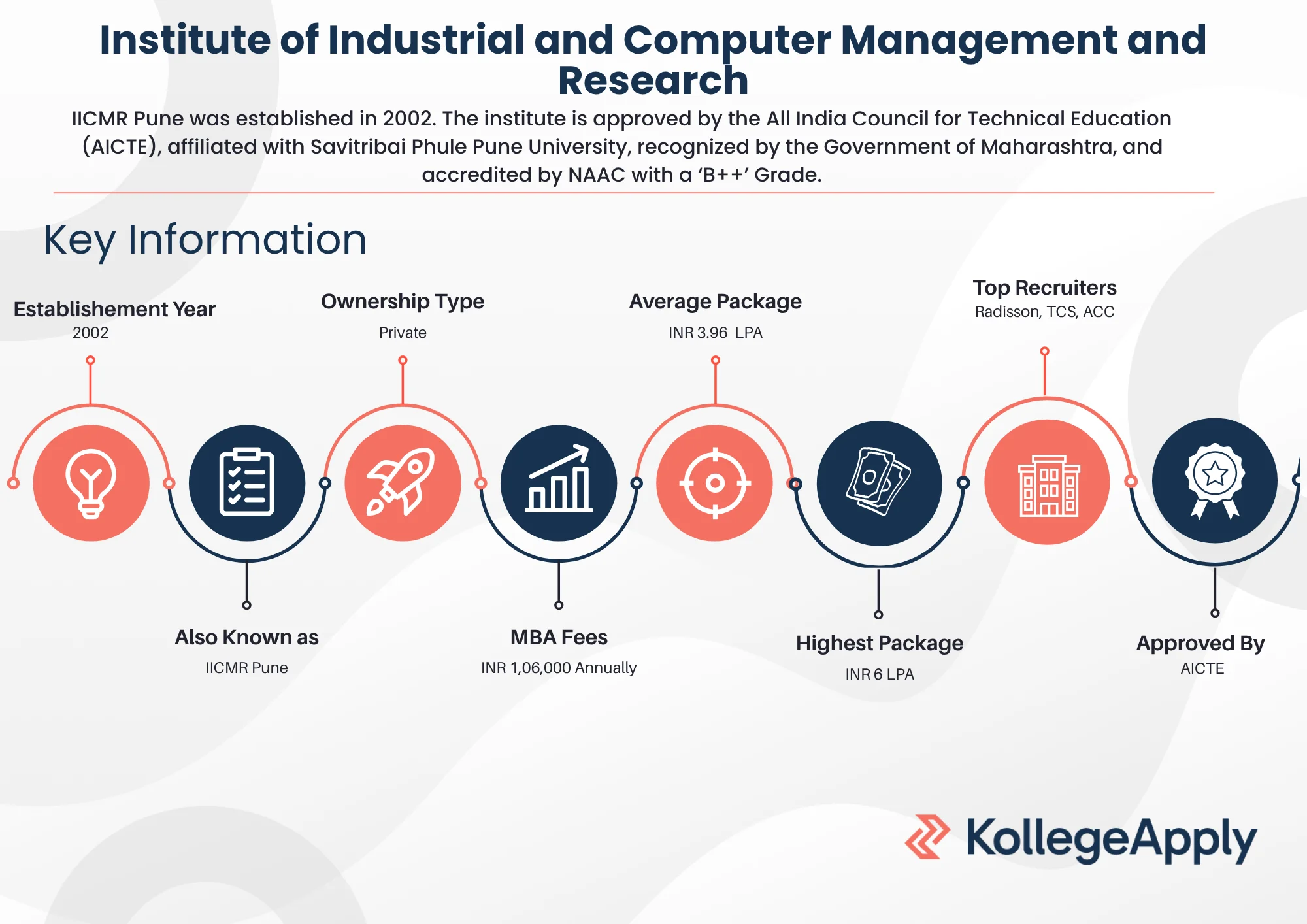 IICMR Pune has a consistent placement record with students placed in top companies such as TCS, Infosys, Cognizant, Capgemini, Tech Mahindra, and Cummins India. The highest salary package offered in 2021–22 was INR 6 LPA, with an average of INR 3.96 LPA.