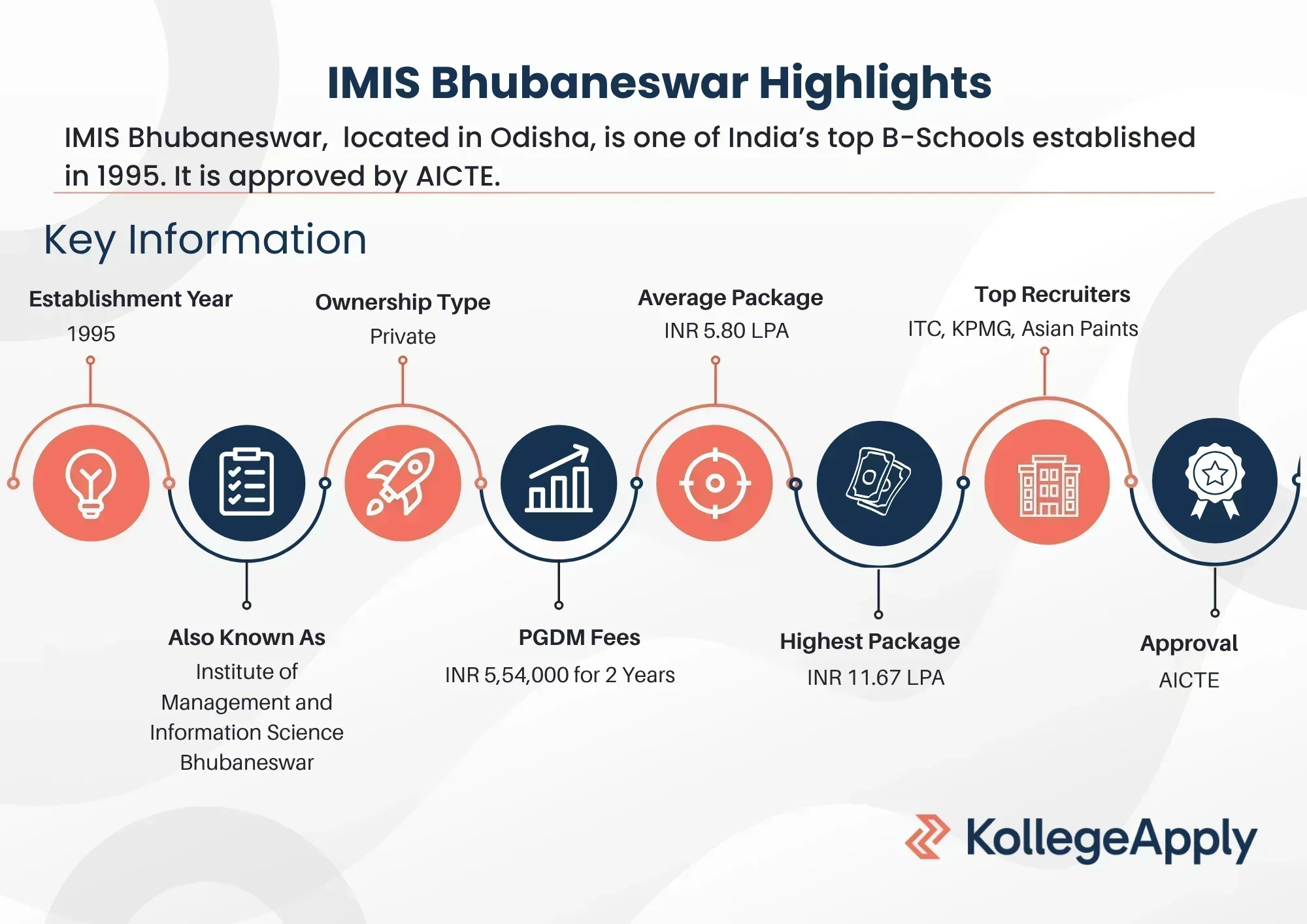 Institute of Management and Information Science maintains a strong placement record, with the highest package reaching INR 11.67 LPA. Some of the top recruiters at IMIS Bhubaneswar include Axis Bank, Bandhan Bank, HDFC Life, V-Guard and JK Cement. The details of the IMIS Bhubaneswar placements are tabulated below: