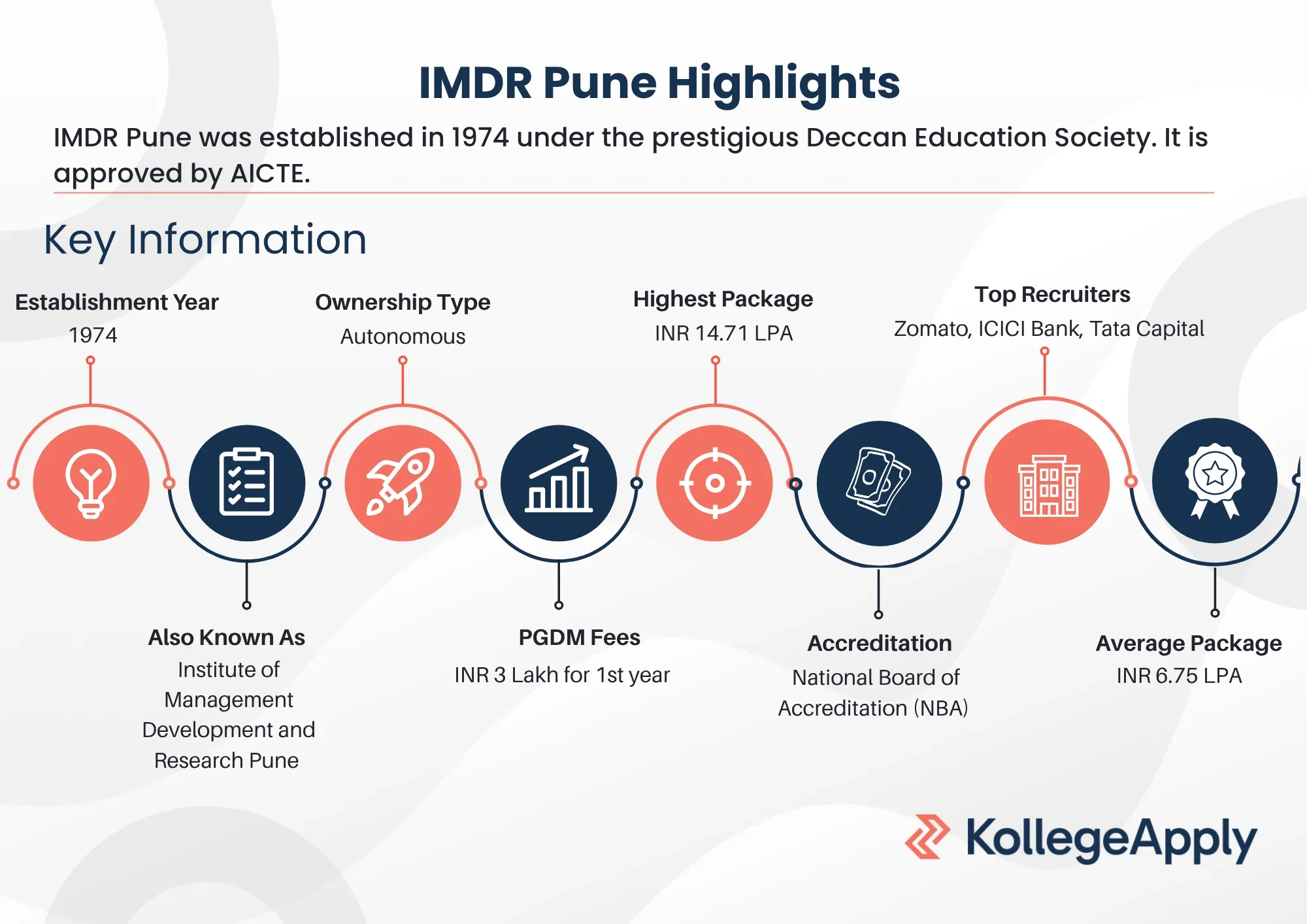 Institute of Management Development and Research (IMDR Pune), established in 1974, is a constituent unit of the Deccan Education Society. It is accredited by the National Board of Accreditation (NBA) and approved by the All India Council for Technical Education (AICTE). IMDR Pune offers a two-year full-time PGDM program, which is recognised as equivalent to an MBA degree by the Association of Indian Universities (AIU). It also offers PGDM for Working Professionals and a Fellow Programme in Management.