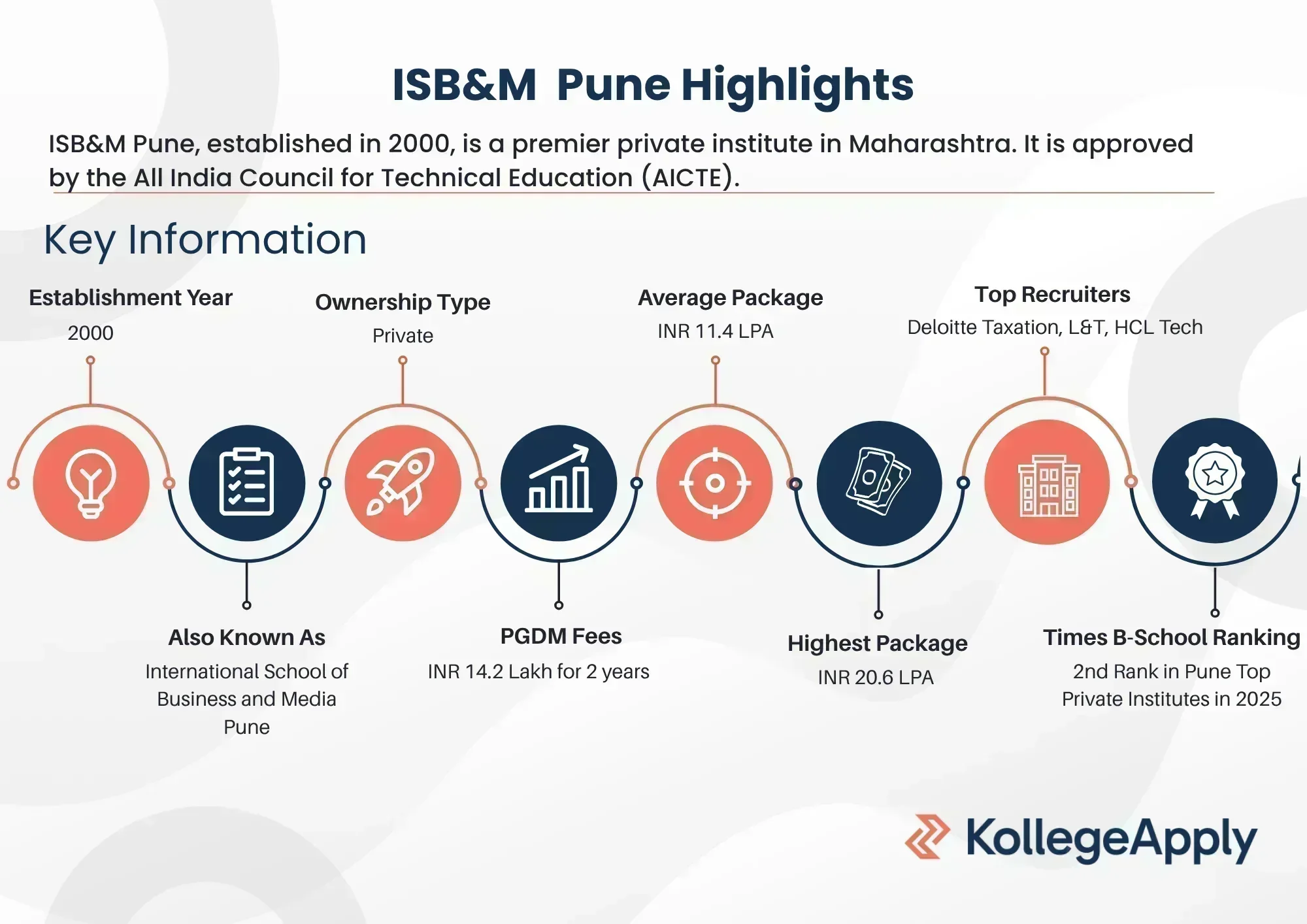 ISB&M (International School of Business and Media Pune), established in 2000, is located in Pune. It is approved by AICTE and offers PGDM courses. The campus is spread over 17 acres and provides all facilities like Wi-Fi-enabled campus, Digital Classrooms, Hostels, Cafeterias, Departmental labs, a Sports Complex, a Library and many others.