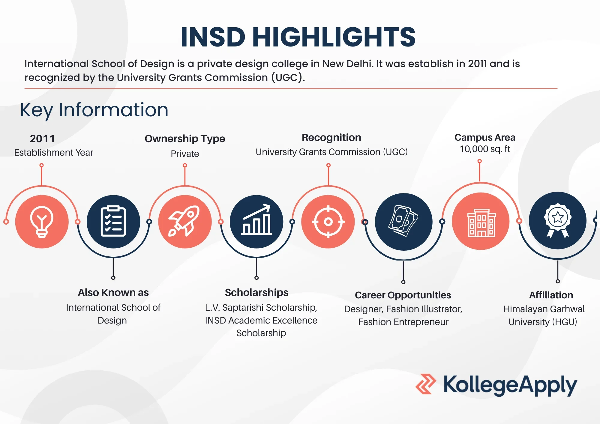 The International School of Design is a private institution established in 2011. INSD has over 50 campuses nationwide and 7 international campuses, with more than 15,000 students graduated and a faculty strength of 120+. The institution has ties with colleges in Europe and the United States and maintains partnerships with over 100 leading brands. INSD offers undergraduate, postgraduate, diploma, advanced diploma and short term programs in Fashion, Textile, Graphic, Interior, Jewellery, Animation and Management. The courses help prepare students for roles such as designers, animators, interior consultants, brand managers and entrepreneurs.