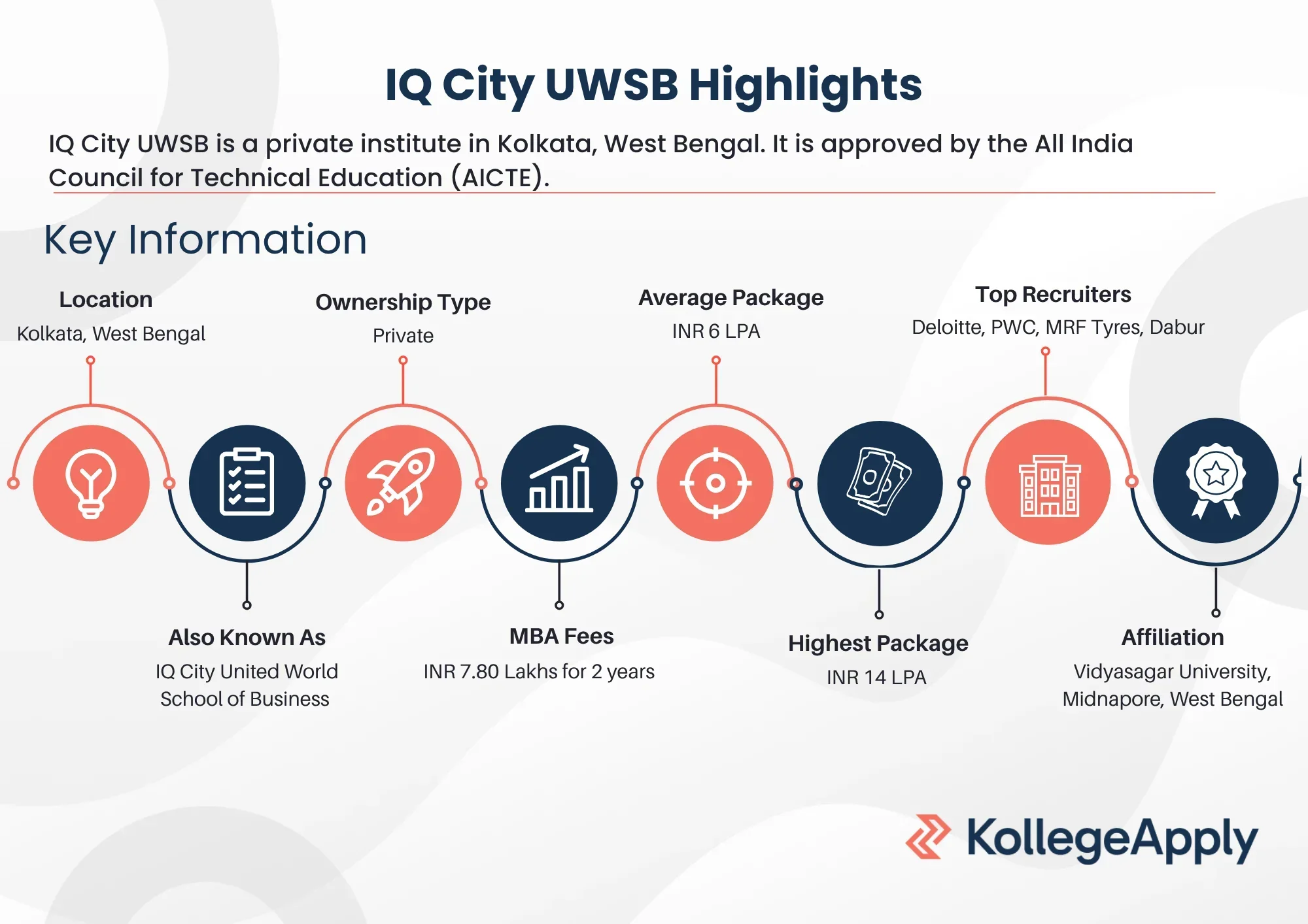 IQ City United World School of Business is a private institute affiliated with Vidyasagar University, Midnapore, West Bengal. IQ City UWSB is approved by AICTE. It offers an undergraduate bachelor's BBA (Hons.) and an MBA program. The flagship MBA program has a fee of INR 7.80 Lakhs, and the BBA (Hons.) has a fee of INR 5 Lakhs.