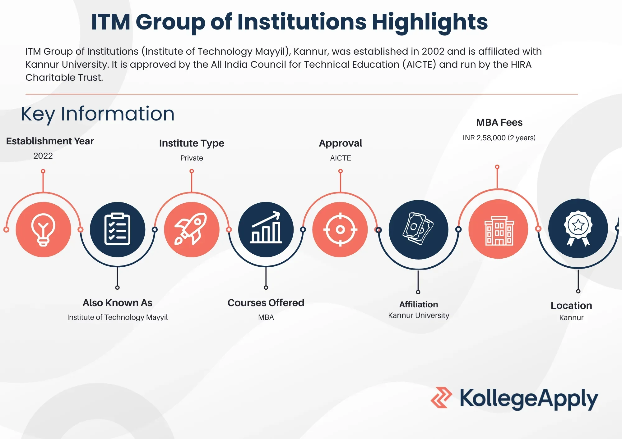 ITM Group of Institutions (Institute of Technology Mayyil), Kannur, was established in 2002 and is affiliated with Kannur University. It is approved by the All India Council for Technical Education (AICTE) and run by the HIRA Charitable Trust. The institute focuses on quality education and industry-oriented management training.
