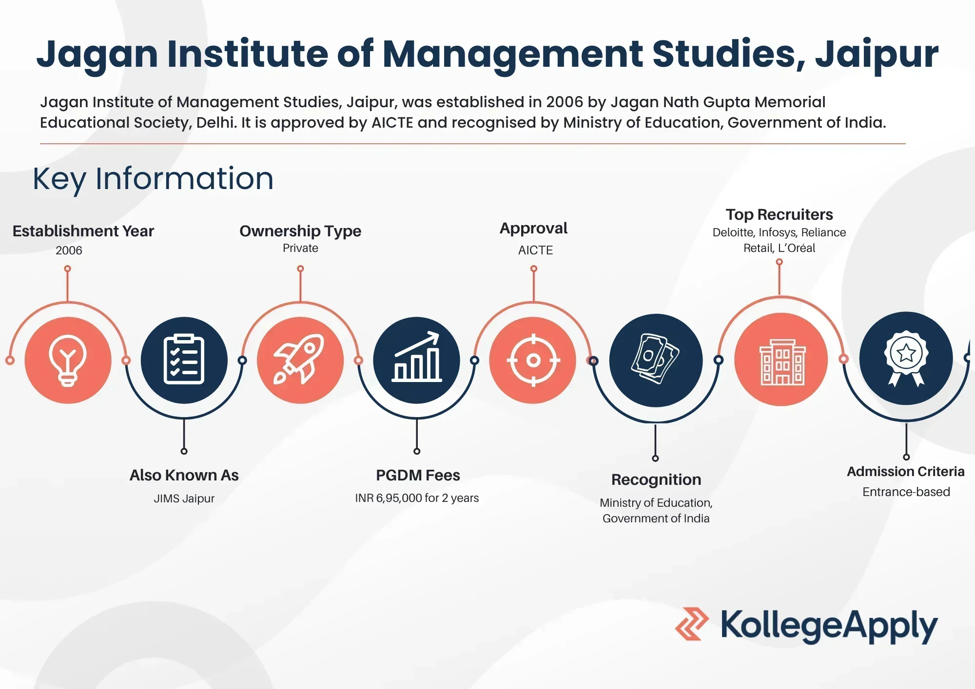 Jagan Institute of Management Studies (JIMS), Jaipur, offers a full-time 2-year PGDM program. Candidates must hold a bachelor’s degree with at least 50% marks to be eligible. Final-year students can also apply. Admission is based on valid CAT, MAT, XAT, CMAT, or ATMA scores, followed by a Written Assessment Test (WAT) and Personal Interview (PI) for shortlisted candidates. The total program fee is approximately INR 6,95,000, which includes an INR 5,000 refundable security deposit. Here is a detailed table to make the process easier for students.