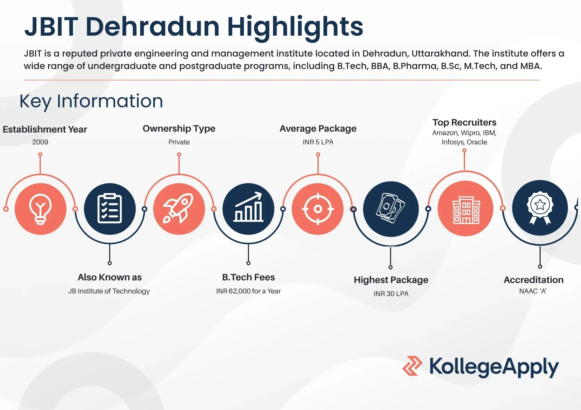 Established in 2009, JB Institute of Technology (JBIT) is a reputed private engineering and management institute located in Dehradun, Uttarakhand established in 2009. Affiliated with Uttarakhand Technical University and approved by AICTE, JBIT holds an 'A' Grade accreditation from NAAC. The institute offers a broad spectrum of undergraduate and postgraduate programs, including B.Tech, BBA, B.Pharma, B.Sc, M.Tech, and MBA. Spread across a sprawling 25-acre campus at the foothills of the Himalayas, JBIT provides modern facilities such as well-equipped hostels, advanced laboratories, a spacious auditorium, a medical clinic, and a health club. Admissions are conducted through both online and offline modes, with some courses requiring entrance exams and personal interviews, ensuring a comprehensive and merit-based selection process.