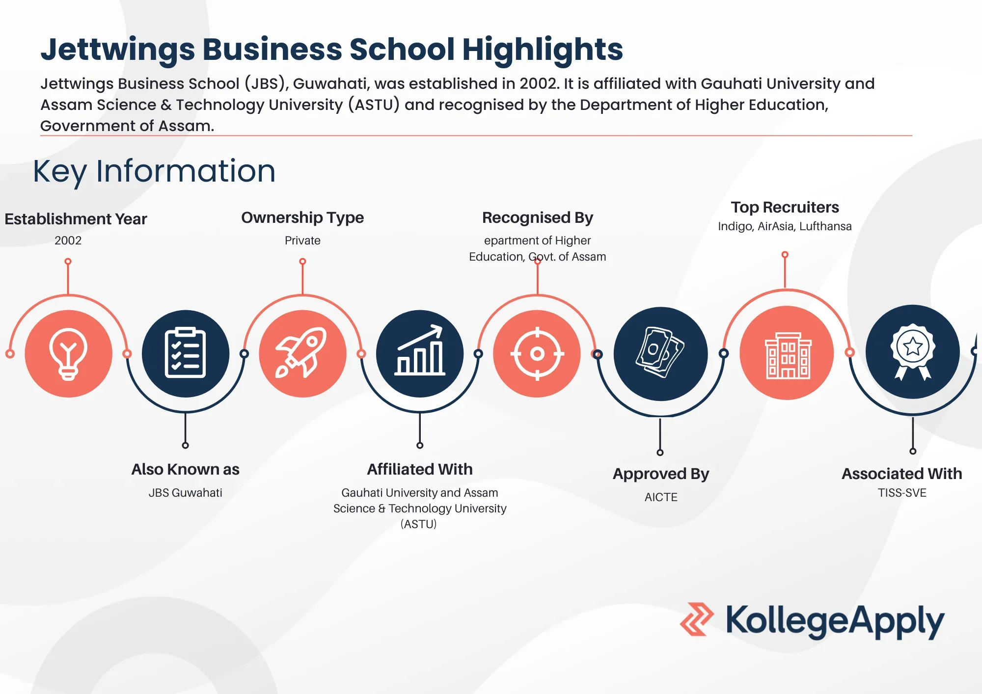 Jettwings Business School (JBS), Guwahati, established in 2002, is a leading private management institute in Northeast India affiliated with Gauhati University and Assam Science & Technology University (ASTU). Recognised by the Department of Higher Education, Government of Assam, and associated with TISS-SVE, JBS offers BBA, B.Com, and PGDBA programs across aviation, hospitality, tourism, and general management. Admissions are merit-based, with scores from UGAT, CBSE, ISC, and AHSEC accepted for undergraduate programs.