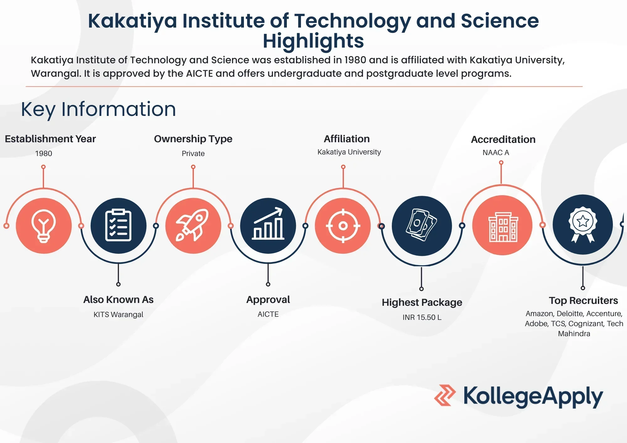 Kakatiya Institute of Technology and Science was established in 1980 and is affiliated with Kakatiya University, Warangal. It is approved by the AICTE and offers undergraduate and postgraduate level programs. The institute offers excellent placement opportunities to final-year students in top-notch companies. In 2025-26, among the top recruiters, Oracle offered a highest package of INR 15.50 LPA, followed by offers from RealPage INR 10.00 LPA and Verisk 9.20 LPA .Some of the eminent recruiters include Amazon, Deloitte, Accenture, Adobe, TCS, Cognizant, Tech Mahindra, and more. The campus features modern infrastructure and world-class facilities for students to take advantage of, such as a hostel, gym, canteen, central library, auditorium, etc. Admission to Kakatiya Institute of Technology and Science is conducted based on TS EAMCET, GATE, TS PGECET, and TS ICET.