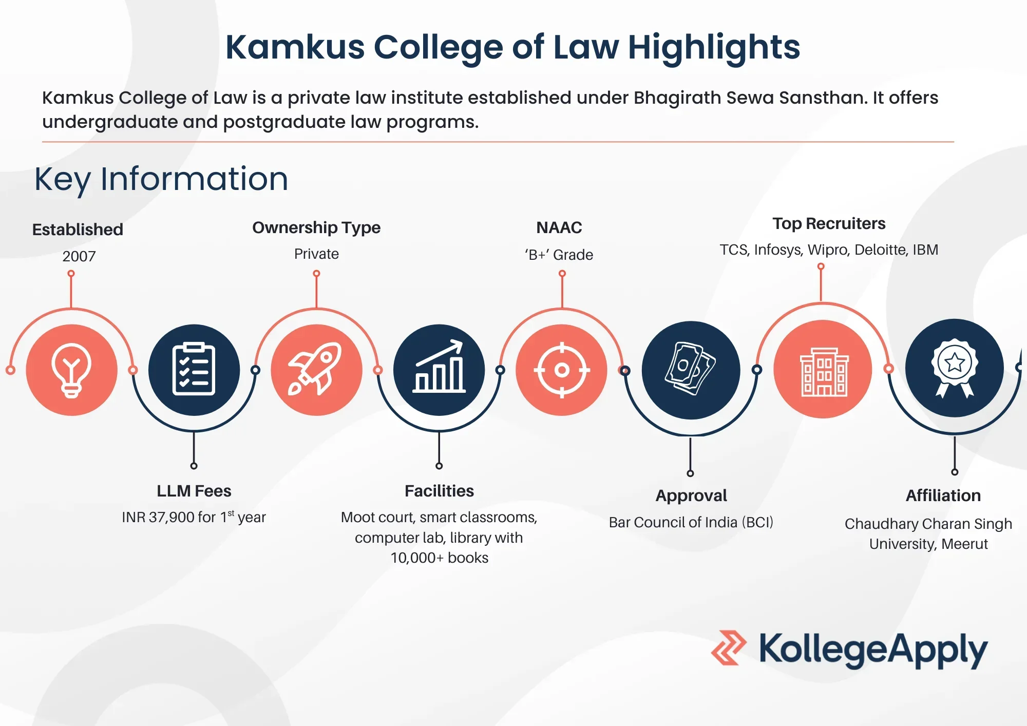 Kamkus College of Law offers LLB (3 years), BA LLB (5 years), B.Com LLB (5 years), and LLM (2 years).