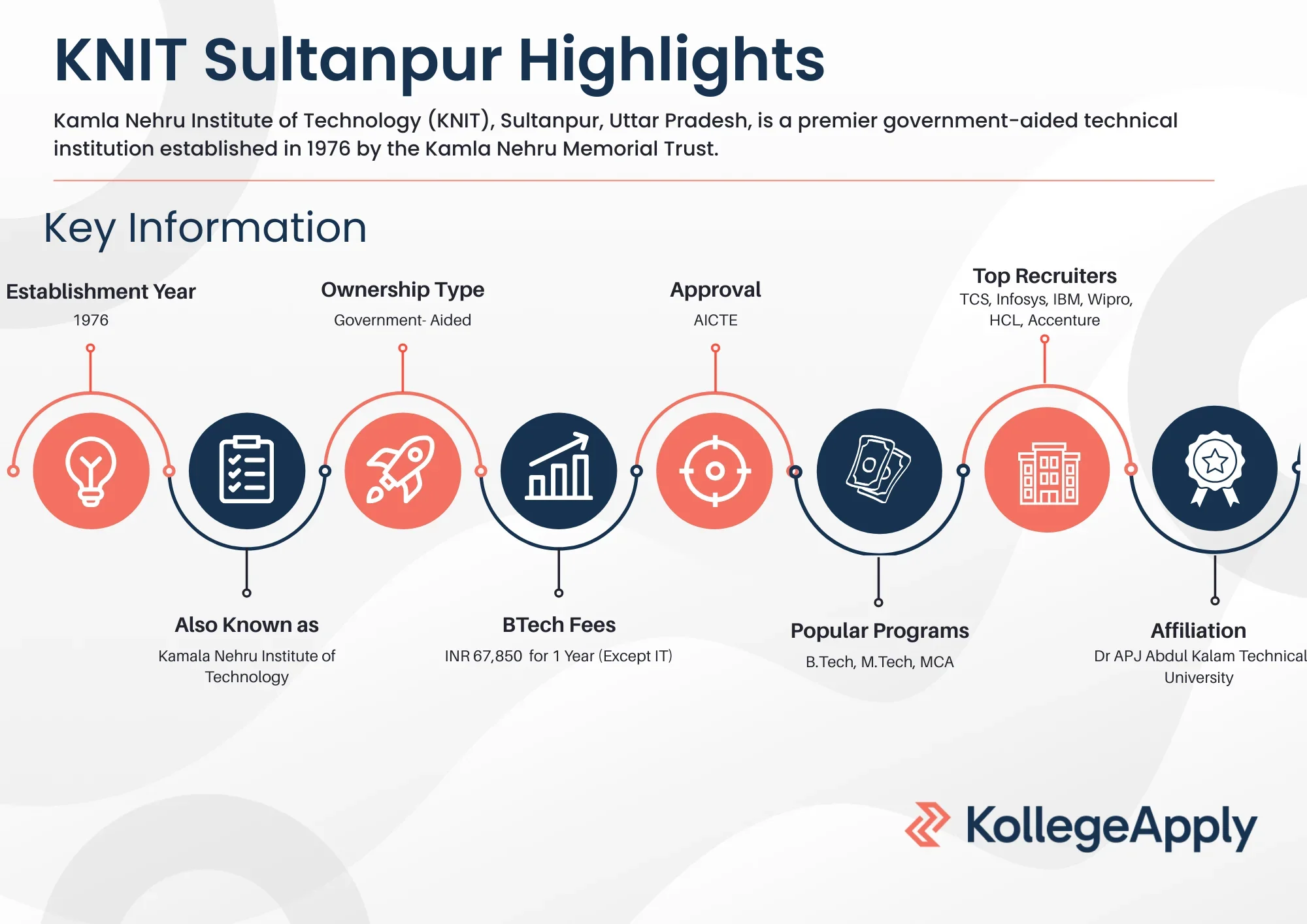 Known for its modern infrastructure and high academic standards, the institute focuses on holistic student development balancing rigorous academics with extracurricular activities. KNIT promotes innovation and excellence, equipping students with technical knowledge and industry-relevant skills. Its strong placement record and scholarship opportunities make it a sought-after destination for aspiring engineers and technologists.