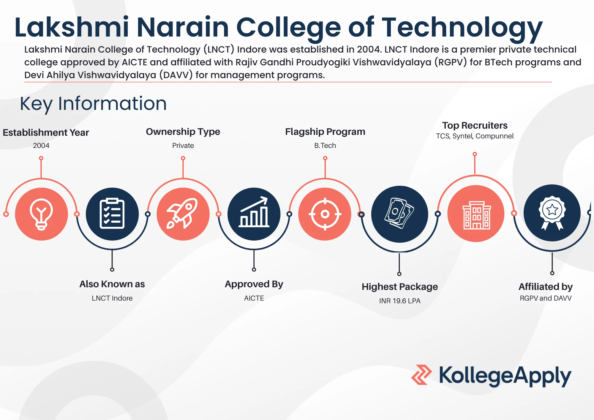 Lakshmi Narain College of Technology (LNCT) Indore was established in 2004. LNCT Indore is a premier private technical college approved by AICTE and affiliated with Rajiv Gandhi Proudyogiki Vishwavidyalaya (RGPV) for BTech programs and Devi Ahilya Vishwavidyalaya (DAVV) for management programs. LNCT Indore offers undergraduate, postgraduate, and diploma programs, such as B.Tech, M.Tech, MBA, and Diploma in Engineering. Admission is granted based on students passing 10+2 in PCM, and they are selected through MP Counselling based on marks obtained in JEE Main or MPPET.