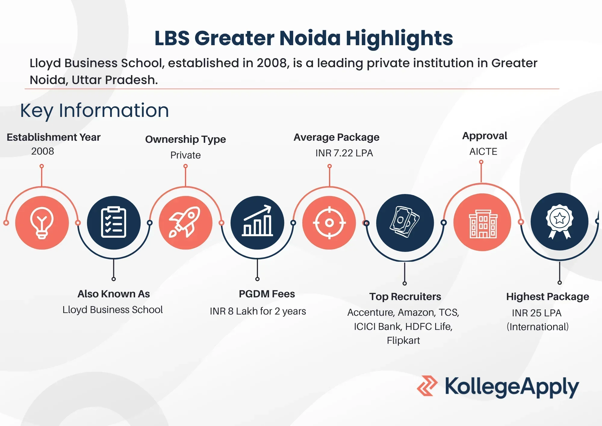 For PGDM admission, candidates must have a bachelor’s degree with 50% aggregate marks. Candidates can apply for PGDM after qualifying in CAT, MAT, XAT, CMAT or GMAT. During the 2023-25 placements, the average package offered was INR 7.22 LPA, and the highest international package was INR 25 LPA. Some of the top recruiters at LBS Greater Noida include Accenture, Amazon, TCS, and ICICI Bank.