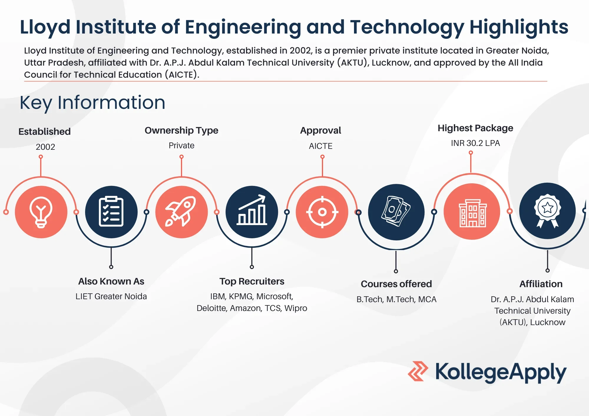 Lloyd Institute of Engineering and Technology is a premier private institute located in Greater Noida, Uttar Pradesh. LIET Greater Noida is affiliated with AKTU Lucknow and approved by AICTE. The institute has academic collaborations with reputable organisations such as NASSCOM, Servotech, CISCO, and Garuda Aerospace, as well as international partnerships with Buckingham University (UK), Pennsylvania State University (USA), and Tribhuvan University (Nepal). LIET Greater Noida is also recognised as a scientific and industrial research organisation by the Department of Scientific & Industrial Research (DSIR), Government of India.