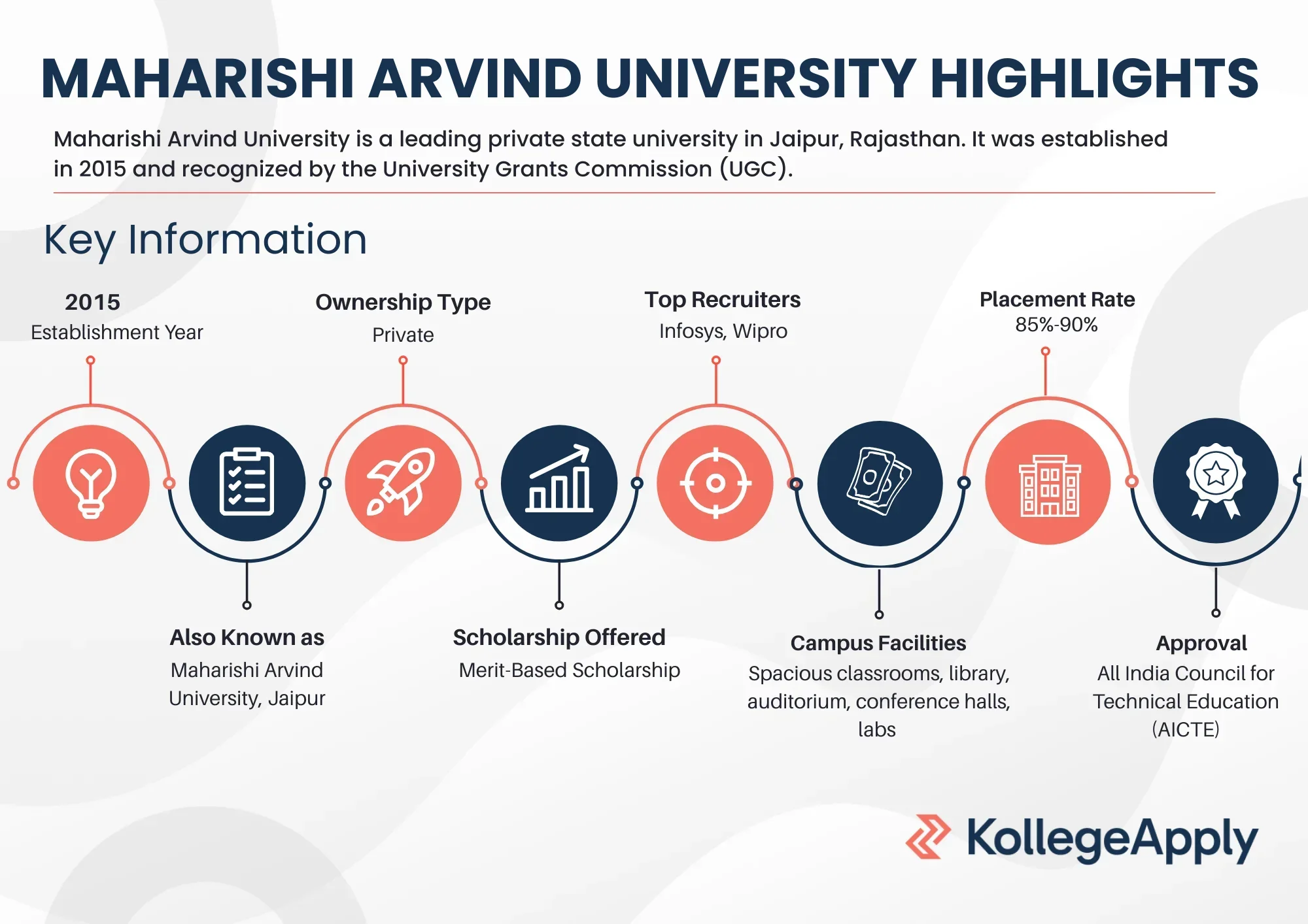Maharishi Arvind University, Jaipur, follows a structured merit/entrance-based admission process for all its courses. Admission is based on merit for most of the courses. Entrance scores of exams like MAULET, CAT, and JEE are also considered. Students have the option to apply both online and offline. The admission process includes application submission, entrance, counselling/interview and document verification.