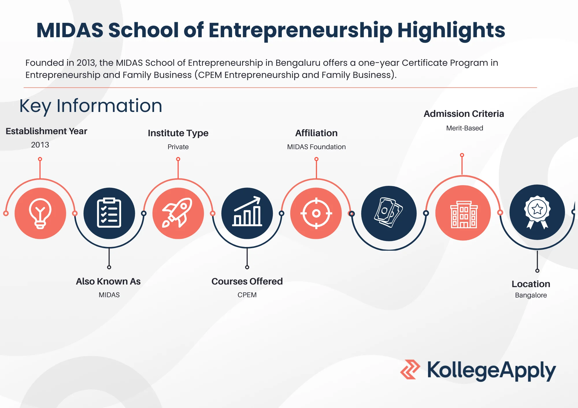 Founded in 2013, the MIDAS School of Entrepreneurship in Bengaluru offers a one-year Certificate Program in Entrepreneurship and Family Business (CPEM Entrepreneurship and Family Business). It is affiliated with the MIDAS Foundation. The one-year program has a total course fee of INR 5,50,000. Applicants must have a bachelor's degree with a minimum of 50 per cent marks (45% for SC/ST candidates). The final selection is based on merit. With an emphasis on startup support, leadership training, and hands-on business development, MIDAS Bengaluru provides a special track for students to establish or develop family-owned or independent businesses.