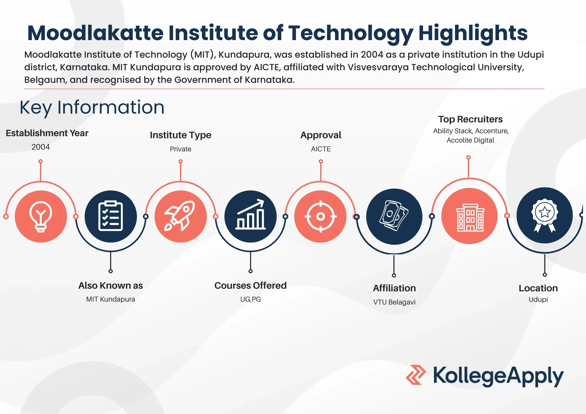 Moodlakatte Institute of Technology (MIT), Kundapura, was established in 2004 as a private institution in the Udupi district, Karnataka. MIT Kundapura is approved by AICTE, affiliated with Visvesvaraya Technological University, Belgaum, and recognised by the Government of Karnataka. MIT Kundapura is also NAAC-accredited, making it a prestigious institute. Moodlakatte Institute of Technology offers UG and PG courses in engineering, management, and computer applications. Admissions are entrance-based.