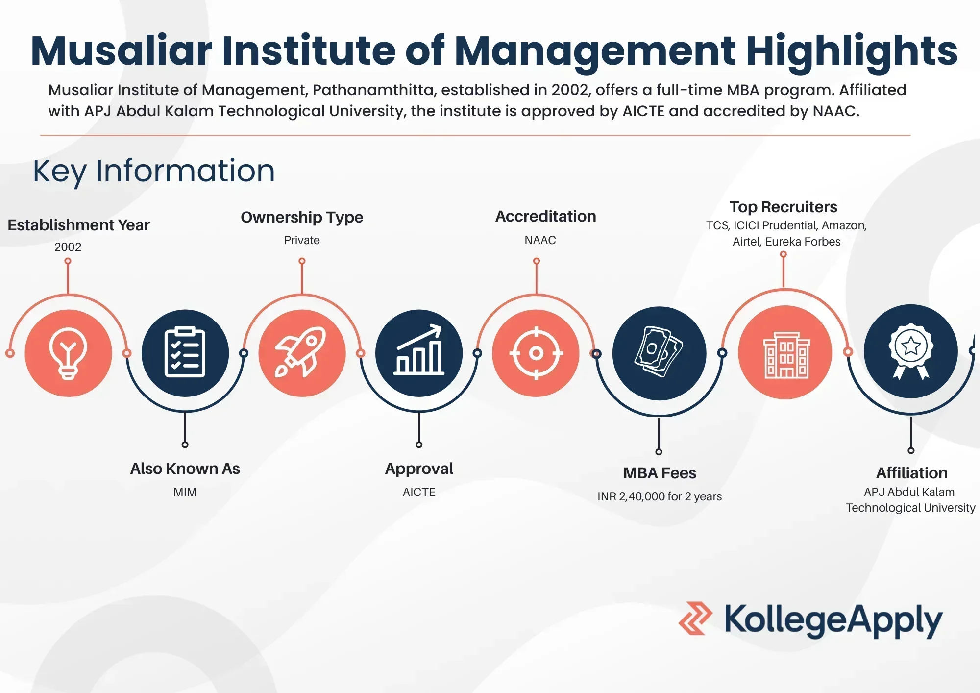 Musaliar Institute of Management Pathanamthitta is a well-known institution under the Musaliar College Trust, established in 2002. It offers a two-year full-time MBA program, affiliated with APJ Abdul Kalam Technological University and approved by the All India Council for Technical Education (AICTE). The college is also accredited by the NAAC.