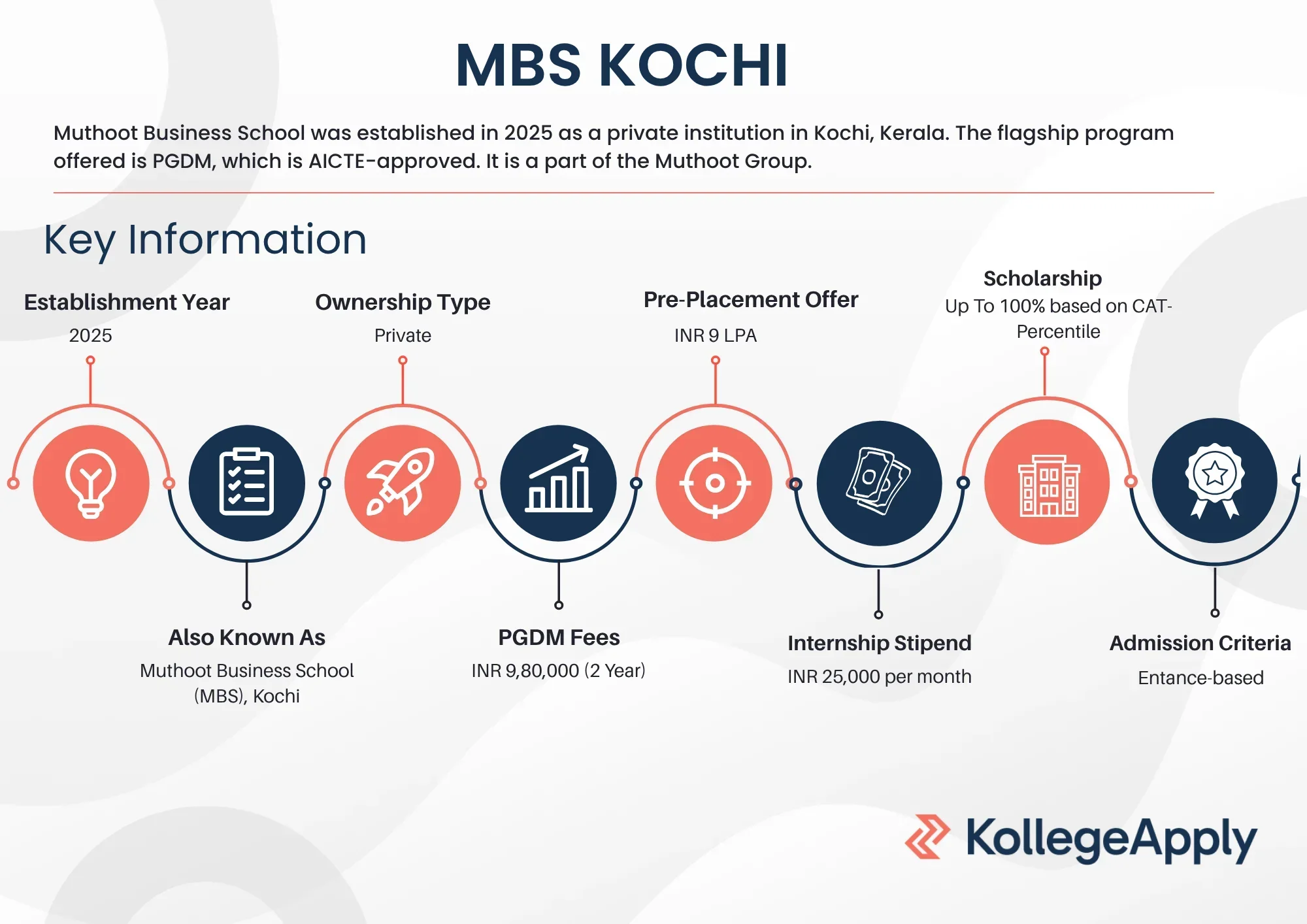 Muthoot Business School (MBS), Kochi, offers scholarships of up to 100% based on CAT percentile. The institute has a Pre Placement Offer (PPO) of INR 9 LPA and provides a paid internship, which can be started before the commencement of the course, with a stipend of INR 25,000 per month.