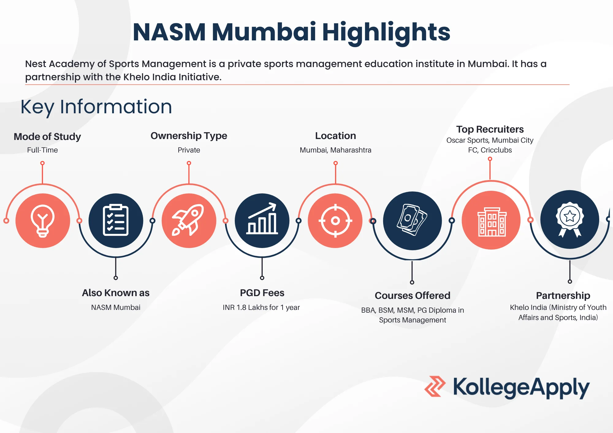Nest Academy of Sports Management (NASM) in Mumbai is a premier institution specializing in sports management education. It is ranked 1st in India as a Private Higher Education Institution for Sports & Co-Curricular Activities by the Education World India Private Education Ranking 2021-22. NASM also has a partnership with the Ministry of Youth Affairs and Sports’ ‘Khelo India’ initiative.