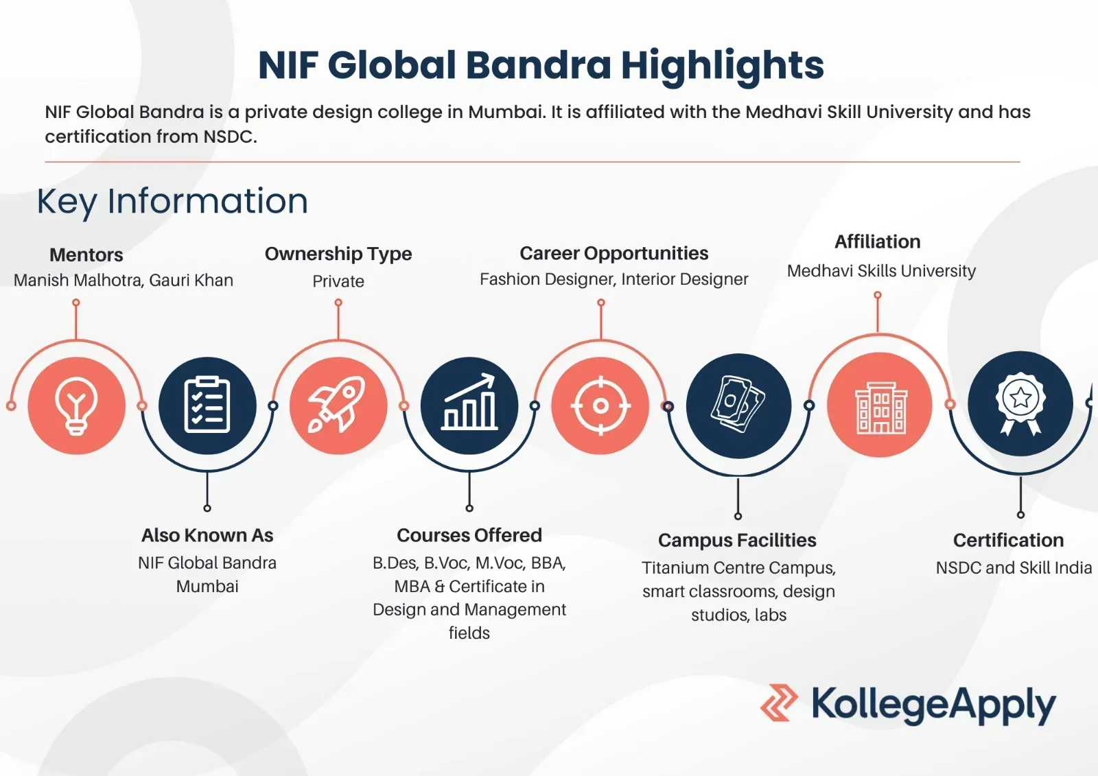 NIF Global Bandra is a well-known design and management college in Mumbai. It is affiliated with Medhavi Skills University and has received certifications from NSDC and Skill India. It adheres to National Education Policy 2020 with its courses taught under Work Integrated Skill Education (WISE).The institute also has collaborations with Lakmé Fashion Week, New York Fashion Week, London Fashion Week and Dubai Fashion Week. Mentors here include renowned industry names like Manish Malhotra, Gauri Khan, Twinkle Khanna, Ashley Rebello, Bharat Dorris, and Ananya Panday. It offers undergraduate, postgraduate, diploma and certificate courses in design and management. These include B.Des, B.Voc, M.Voc, M.Des, BBA and MBA.