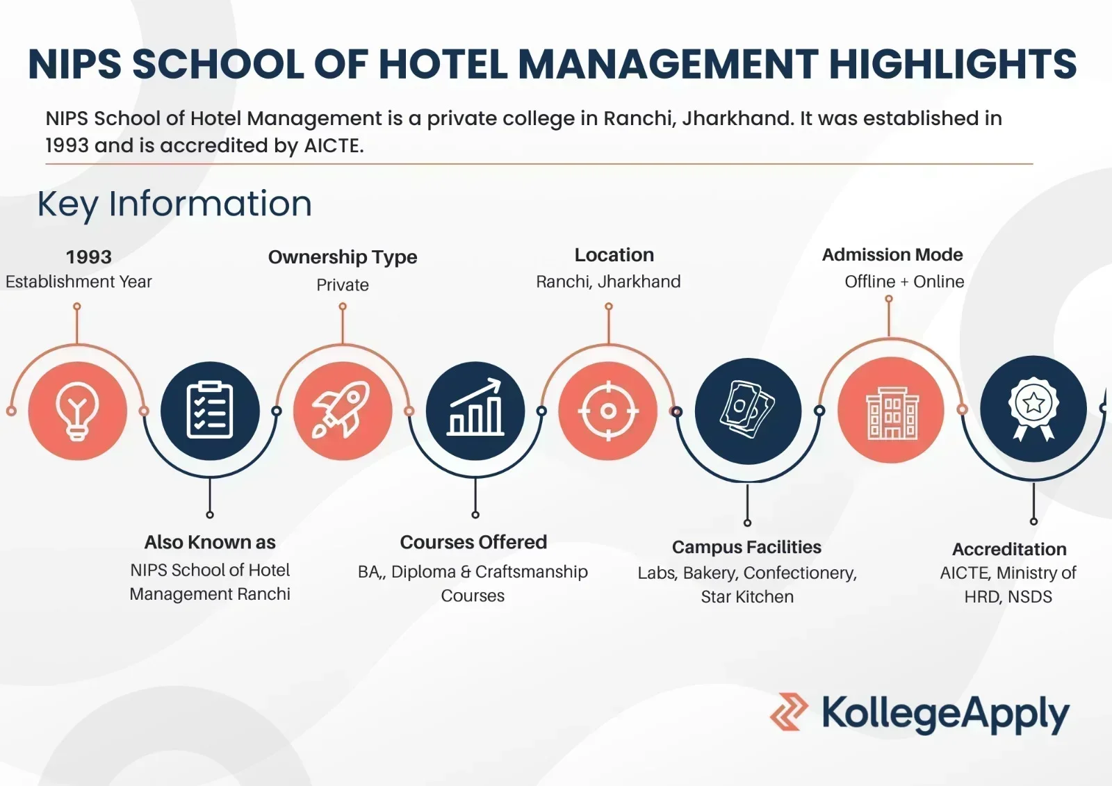 NIPS School of Hotel Management, Ranchi, established in 1993, is a premier private institute dedicated to hospitality education and training. It is affiliated to Maulana Abul Kalam Azad University of Technology (MAKAUT) and approved by AICTE, the institute also holds accreditation from the Indian Federation of Culinary Association (IFCA) and is associated with the National Skill Development Corporation (NSDC). Ranked among the top 90 hotel management institutes globally and recognized as one of the best in Eastern India, NIPS Ranchi offers a wide range of programs including Diploma in Hotel Management & Catering Technology, BA in Hospitality Management, postgraduate programs in hotel and hospitality management, along with short-term specialization courses in food production, bakery, F&B service, and bartending.