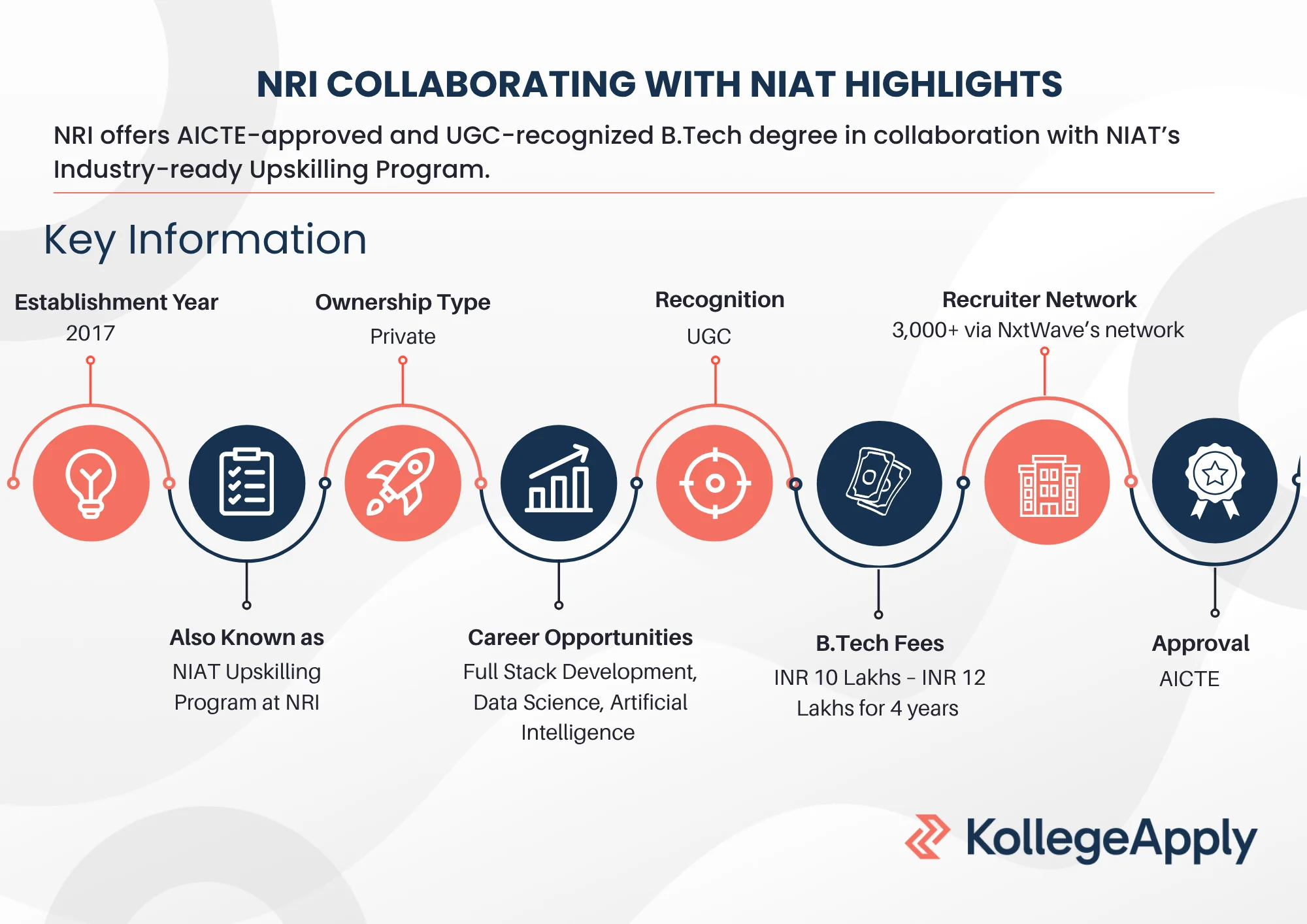 NRI collaborating with NIAT, is a private university in Vijayawada, Andhra Pradesh. The university is recognized by the UGC and approved by AICTE. NIAT (NxtWave Institute of Advanced Technologies) has been recognized as a Tech Pioneer 2024 by the World Economic Forum (WEF).