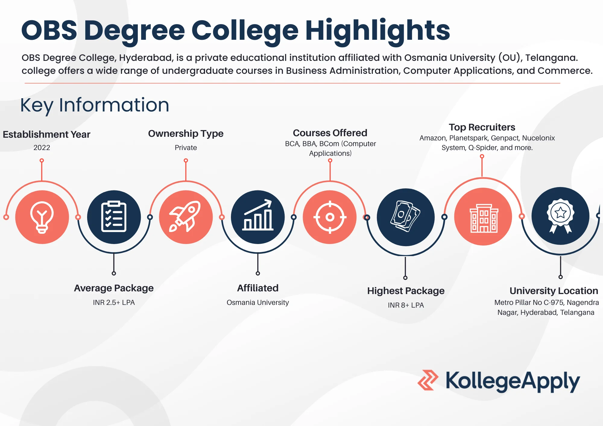 OBS Degree College, Hyderabad, is a private educational institution affiliated with Osmania University (OU), Telangana. The college offers a wide range of undergraduate courses in Business Administration, Computer Applications, and Commerce. Admissions are merit-based, with a focus on holistic education. The campus is equipped with modern infrastructure, including smart classrooms, multiple libraries, conference halls, a cafeteria, and other essential facilities. OBS also provides placement assistance with top recruiters such as Infosys, PlanetSpark, Genpact, Nucleonix Systems, Q-Spiders, and Amazon.