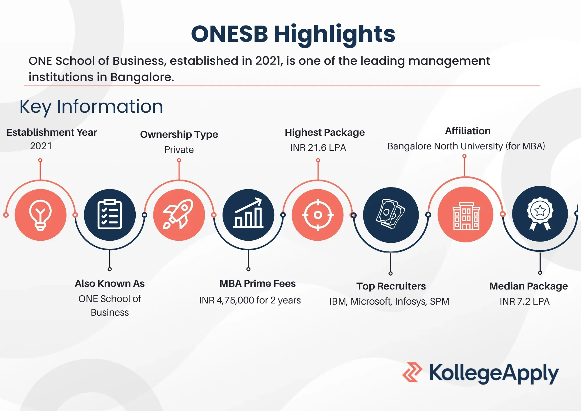 ONE School of Business, established in 2021, is a private college in Bangalore. ONE School of Business offers courses like BBA, BCA and MBA. The MBA course at ONESB is approved by AICTE and affiliated with Bangalore North University. MBA Prime course fee is INR 4,75,000 for two years.