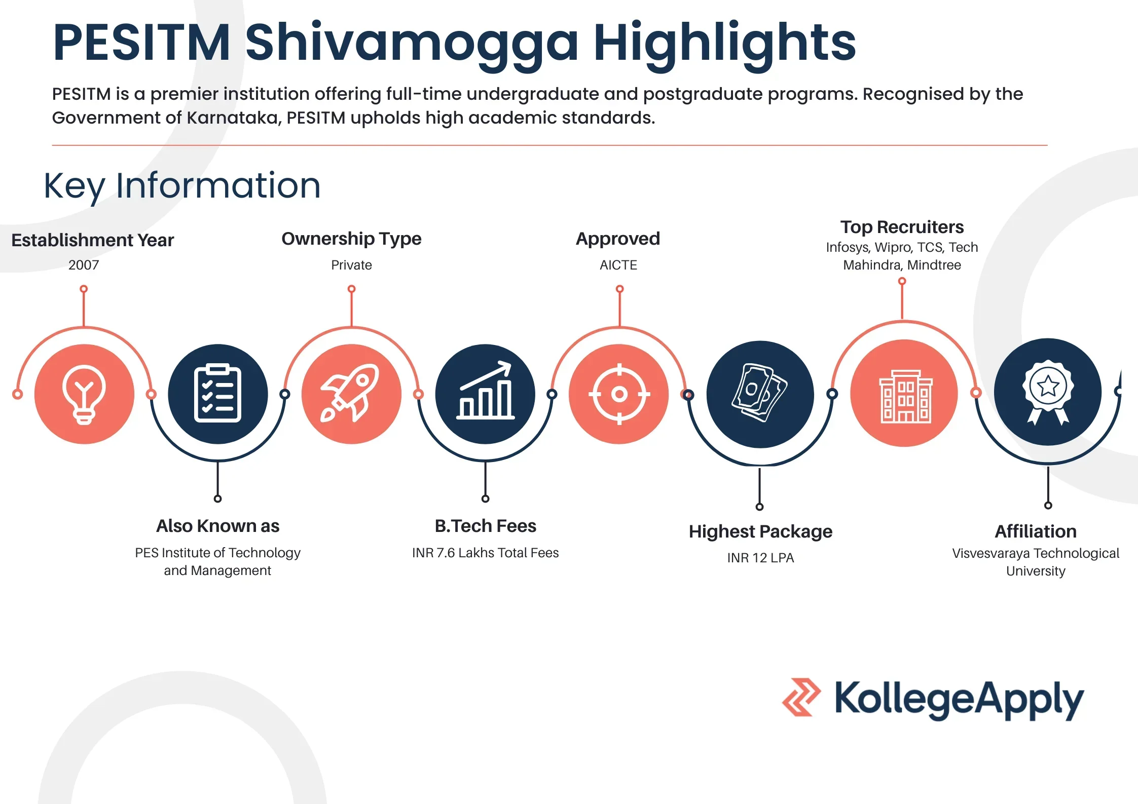 Established in 2007, PES Institute of Technology and Management (PESITM) is a premier institution offering full-time undergraduate and postgraduate programs. Recognised by the Government of Karnataka, approved by AICTE, and affiliated with Visvesvaraya Technological University, PESITM upholds high academic standards. Admissions are based on merit and entrance exams such as KCET, PGCET, COMEDK UGET, KMAT, CMAT, or JEE Main, followed by GD and PI. Renowned for its strong placement record, PESITM attracts top recruiters like Infosys, Wipro, TCS, and Accenture.