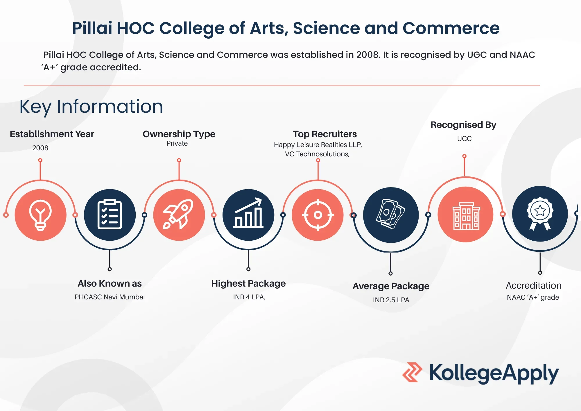 Offers placement opportunities to its students in companies like Piramal Finance, Axis Securities, Pillai HOCL Educational Campus, Happy Leisure Realities LLP, VC Technosolutions, AMPA Orthodontics, Byzan Systems Pvt. Ltd., with a placement rate of 60-80%. The highest package at PHCASC Navi Mumbai is INR 4 LPA, and the average package is INR 2.5 LPA- INR 4 LPA.