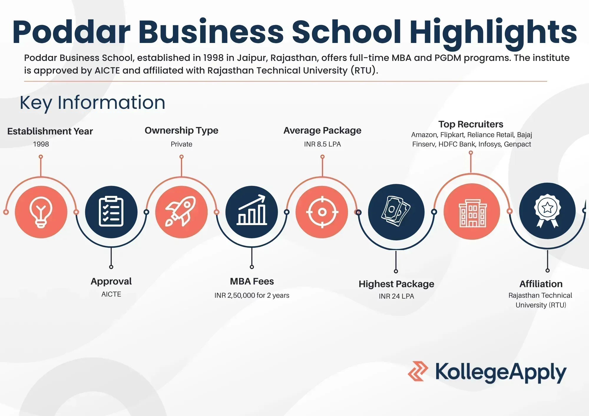 Poddar Business School, established in 1998 in Jaipur, Rajasthan, offers full-time MBA and PGDM programs. The institute is approved by the All India Council for Technical Education (AICTE) and affiliated with Rajasthan Technical University (RTU). Poddar Business School admissions are based on CAT, MAT, CMAT, GMAT or XAT scores, followed by a Personal Interview (PI). The total fee for the two-year MBA program is approximately INR 2,50,000.