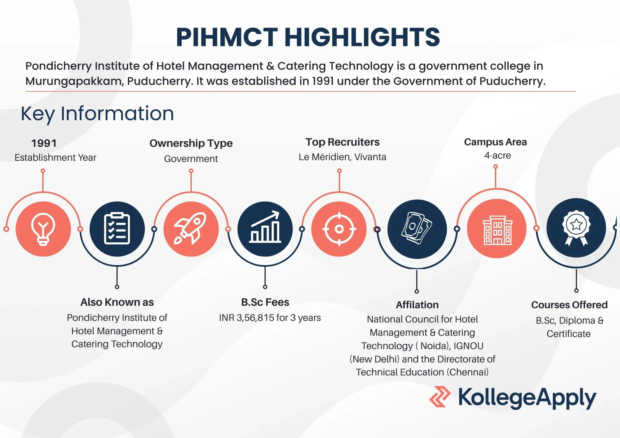 PIHMCT offers training and placement support. Leading hospitality brands like Le Méridien, Vivanta, The Park Hotel, Hyatt, Taj Group of Hotels, Oberoi, ITC Hotels, and Nestlé recruit from here. The 4-acre campus in Puducherry has 5 multi-storey buildings and 9 separate labs. Facilities here include training kitchens, bakeries, restaurants, housekeeping labs and classrooms.