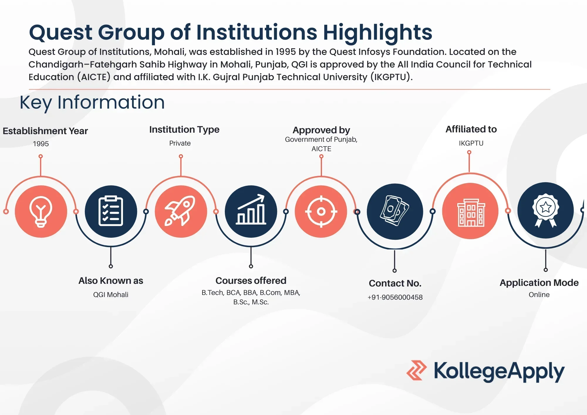 Quest Group of Institutions, Mohali, was established in 1995 by the Quest Infosys Foundation. Located on the Chandigarh–Fatehgarh Sahib Highway in Mohali, Punjab, QGI is approved by the All India Council for Technical Education (AICTE) and affiliated with I.K. Gujral Punjab Technical University (IKGPTU). The institute offers a variety of undergraduate and postgraduate programs in engineering, IT, commerce, management, paramedical sciences, and tourism. QGI is ISO 9001:2008 certified and is recognised for its industry-linked curriculum, modern infrastructure, and experienced faculty.