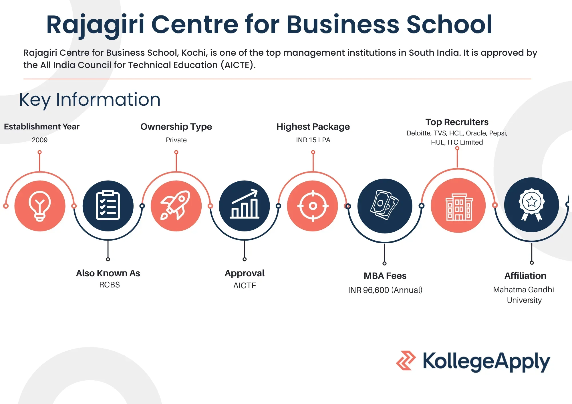 Rajagiri Centre for Business School (RCBS) is one of the top management institutions in South India. It is approved by the AICTE. RCBS Kochi offers MBA, PGDM and MA in Human Resource Management. The MBA program is offered in 6 specialisations: General, Finance, Business Analytics, Marketing, Operations, and System Management.