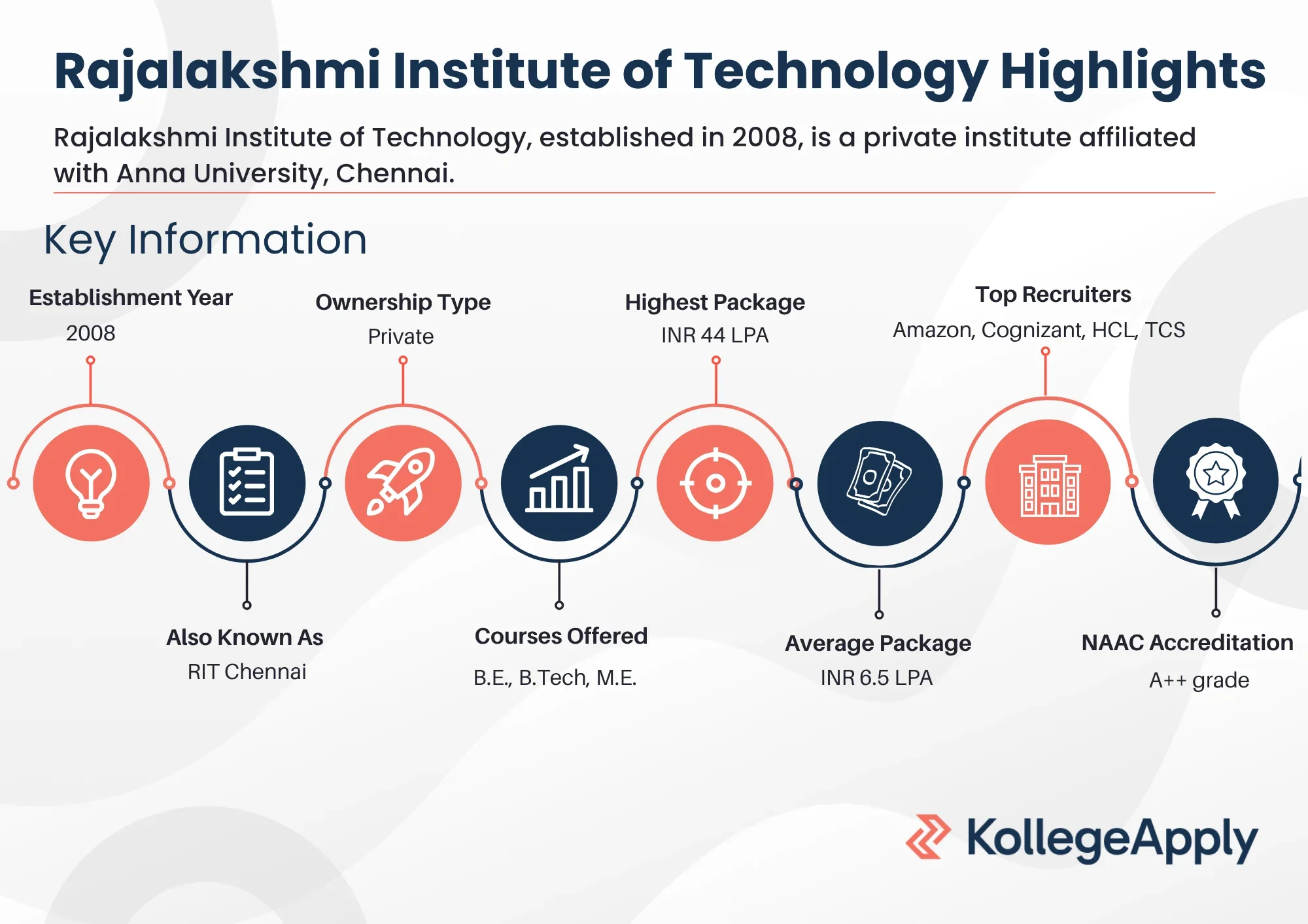 Rajalakshmi Institute of Technology is an autonomous engineering college in Chennai. It is a part of the well-known Rajalakshmi Institutions. It was established in 2008 and is affiliated with Anna University, Chennai. The institute is approved by AICTE and offers NBA-accredited courses. RIT Chennai has also received the A++ grade from NAAC for its quality education.