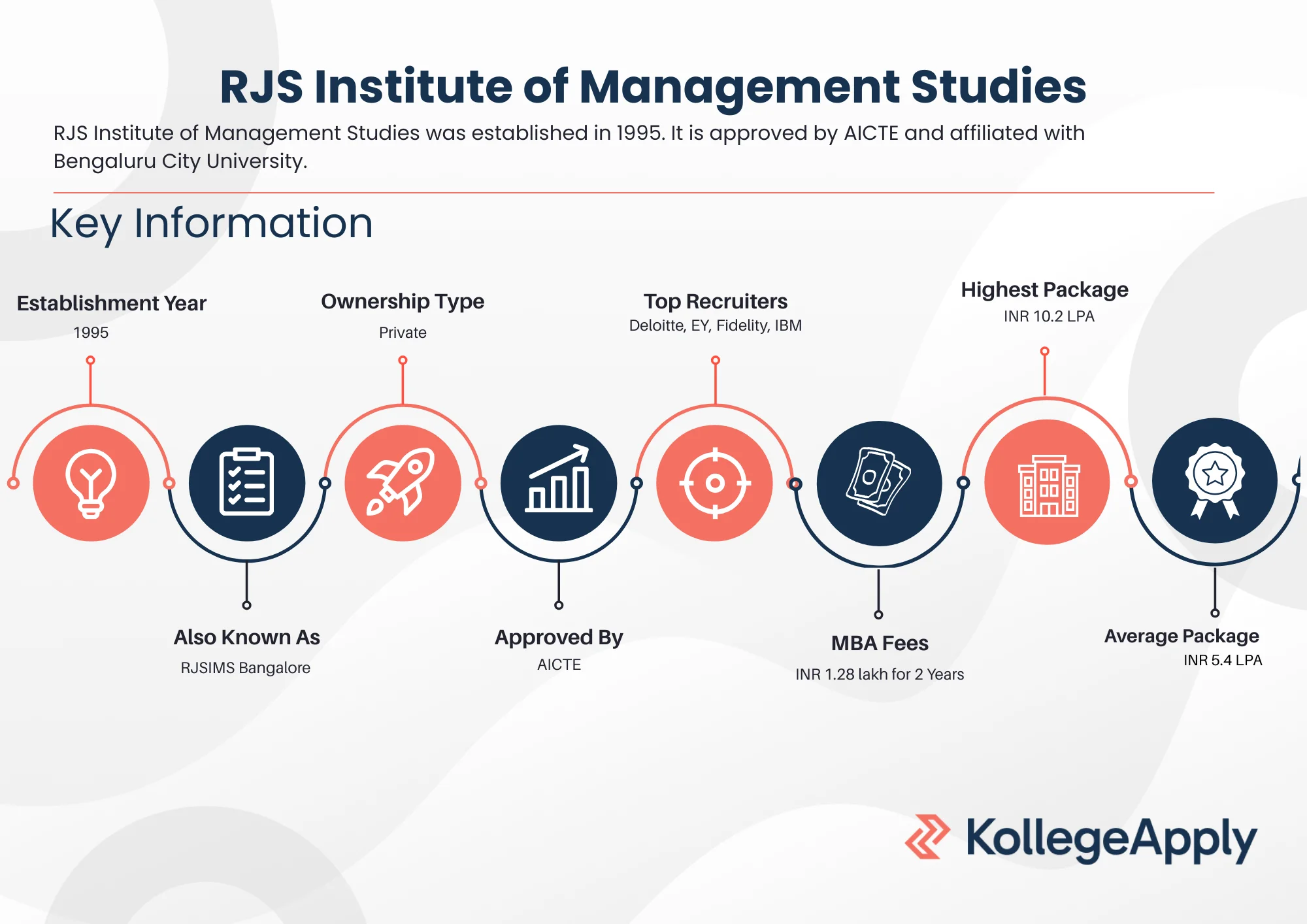 In the 2023-2024 batch, RJS Institute of Management Studies achieved a placement percentage of 62.6%, with 81 students placed. The highest salary package was INR 10.2 LPA, and the average package was INR 5.4 LPA. Top recruiters included Deloitte, EY, IBM, Fidelity, Citi Bank, Angel Broking, and CommonFloor.com.