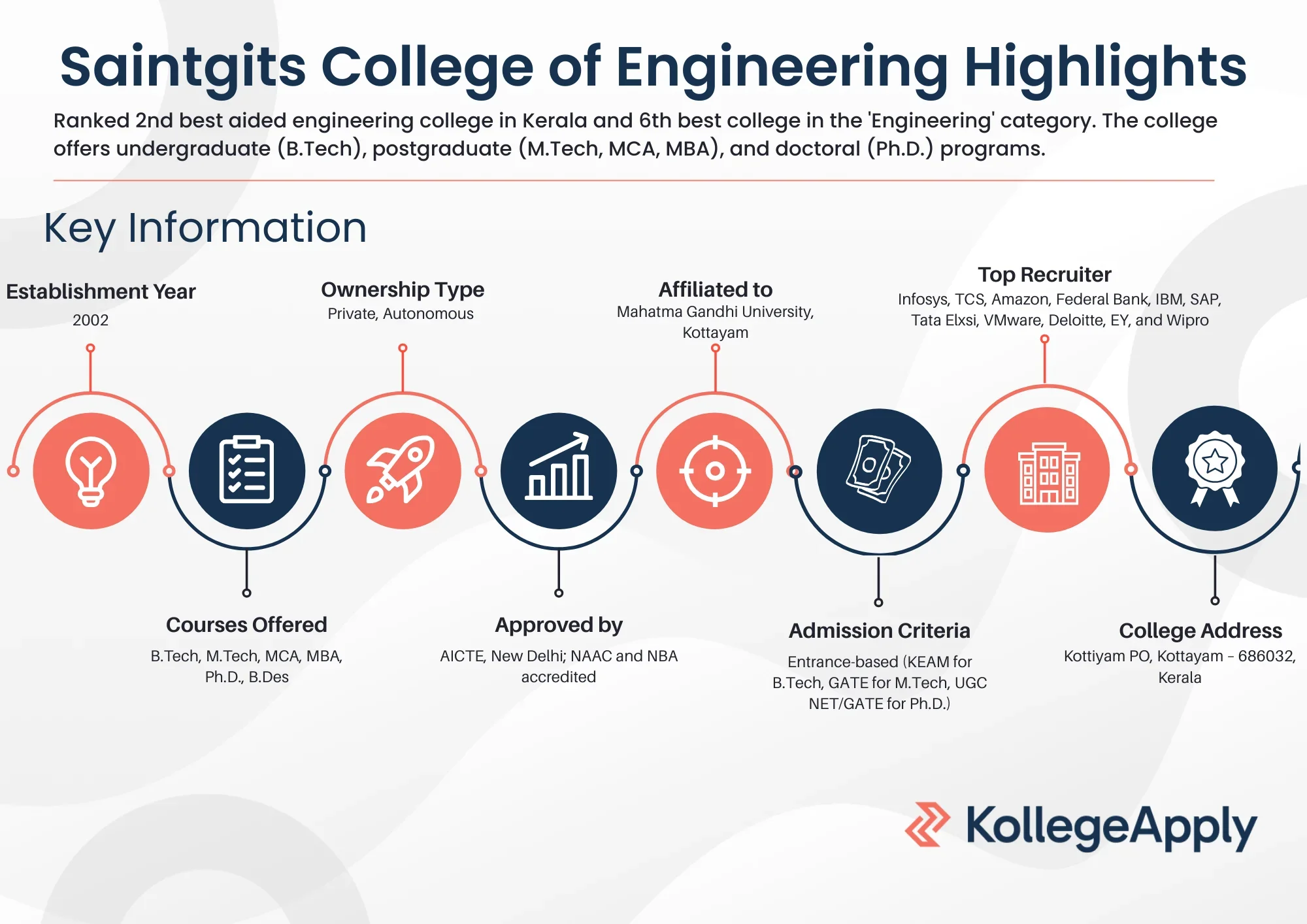 Saintgits College of Engineering, established in 2002 in Kottayam, Kerala, is a premier private engineering institution under the Saintgits Group of Institutions, founded by a group of distinguished academicians dedicated to fostering knowledge and innovation. Affiliated with Mahatma Gandhi University, Kottayam, and approved by the All India Council for Technical Education (AICTE), New Delhi, the college has earned autonomous status from the Government of Kerala. Certified by NAAC and NBA, it is the only autonomous institution in Kerala with nine NBA-accredited programs. Ranked 2nd best aided engineering college in Kerala and 6th best college in the 'Engineering' category. The college offers undergraduate (B.Tech), postgraduate (M.Tech, MCA, MBA), and doctoral (Ph.D.) programs, admitting over 300 students annually. Saintgits has achieved 100% seat occupancy with its placement records with top recruiters like Infosys, TCS, and Amazon.