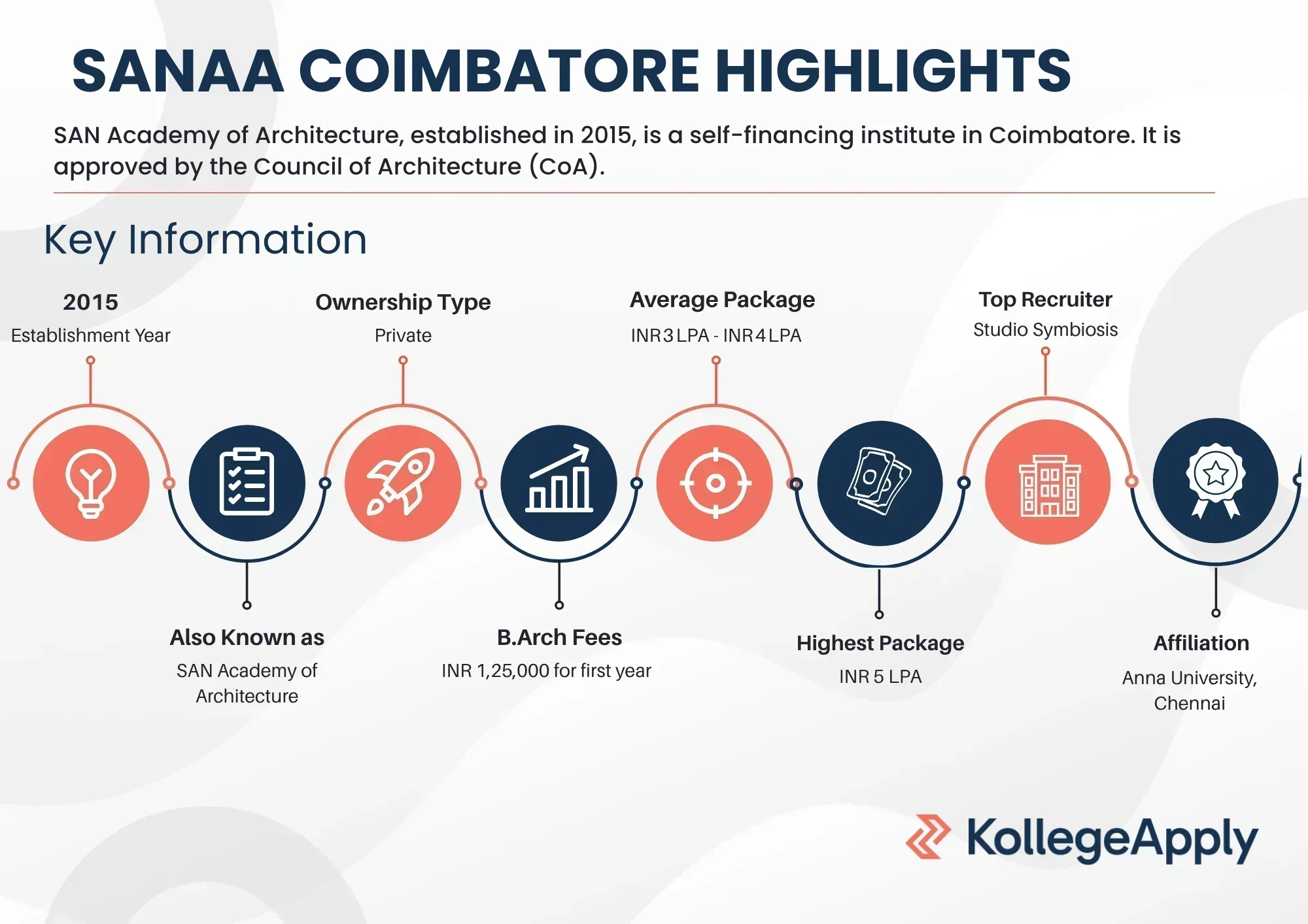 SANAA Coimbatore has a dedicated Training and Placement Cell that has strong tie-ups with architecture and design firms. Students are regularly placed or interned with firms like Studio Symbiosis, BIOME Environmental Solutions, Transform Architects, Starchitect, Earthenhive Architects and PAT Architects. Graduates pursue career roles like architectural designers, urban planners, interior designers and research architects. SANAA campus at Coimbatore has facilities like smart classrooms, design studios, computer labs, a modern library, an auditorium, seminar halls, sports and medical facilities.