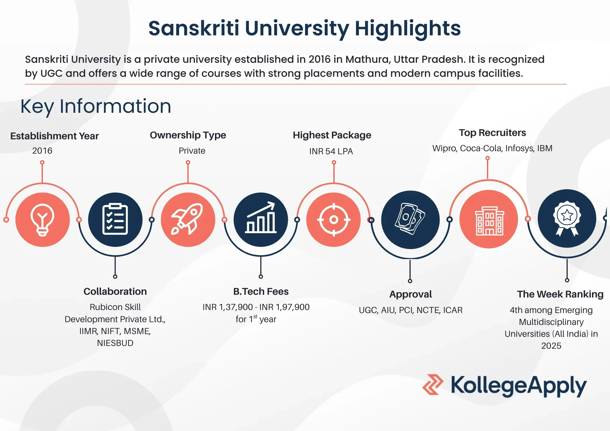 Sanskriti University is one of India's leading industry-oriented universities located in Mathura, Uttar Pradesh. It was established in 2016 and is accredited by NAAC. The university is recognized by UGC and approved by bodies like AICTE, PCI, INC, etc. Sanskriti University has been ranked 4th among the Emerging Multidisciplinary Universities (All India) by The Week in 2025.