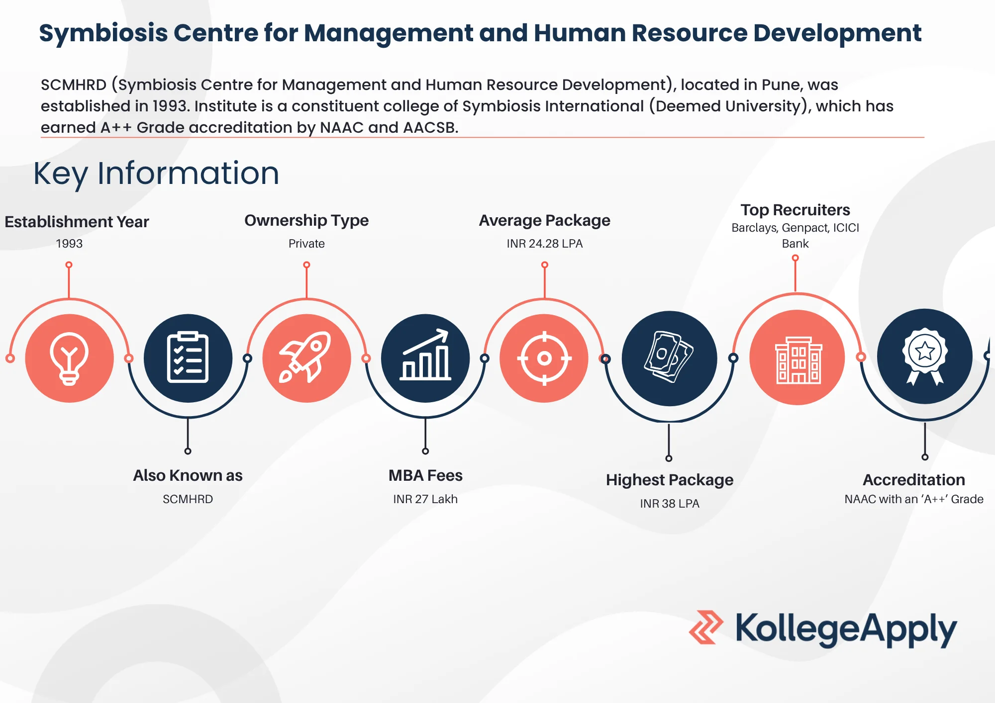 SCMHRD (Symbiosis Centre for Management and Human Resource Development), located in Pune, was established in 1993. Institute is a constituent college of Symbiosis International (Deemed University), which has earned A++ Grade accreditation by NAAC and AACSB. SCMHRD offers PG courses to students, and its flagship course is MBA.