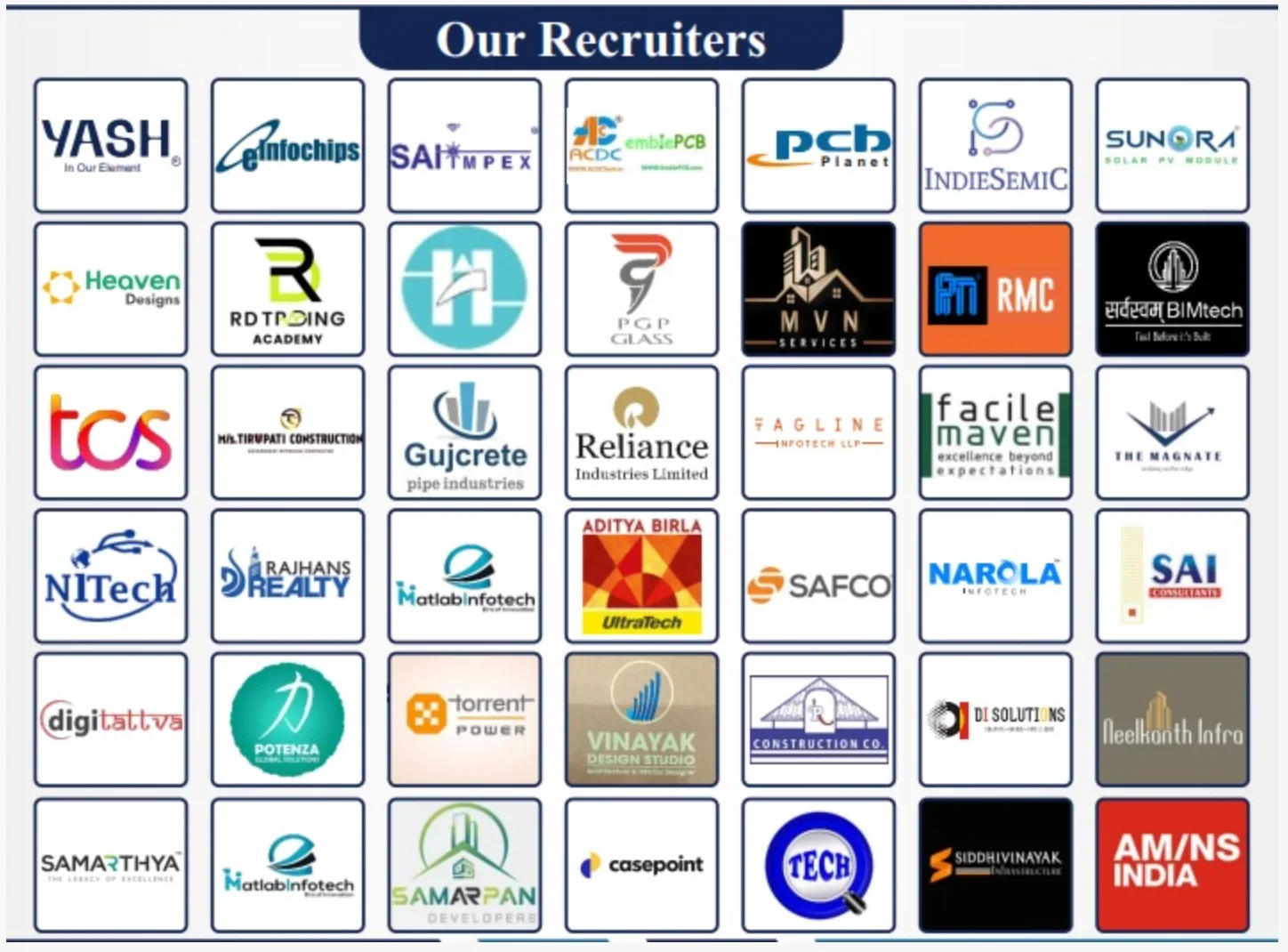 SSASIT Placement cell has witnessed excellent outcomes across all branches. While 82% of Computer Engineering students were placed, Civil, Mechanical, and Electronics & Communication branches achieved a 100% placement rate. Top recruiters included TCS, Aditya Birla Group, Reliance Industries, Nitech, Safco, IndieSemic, Heaven Designs, and MVN Services, reflecting strong industry connections and opportunities for students.