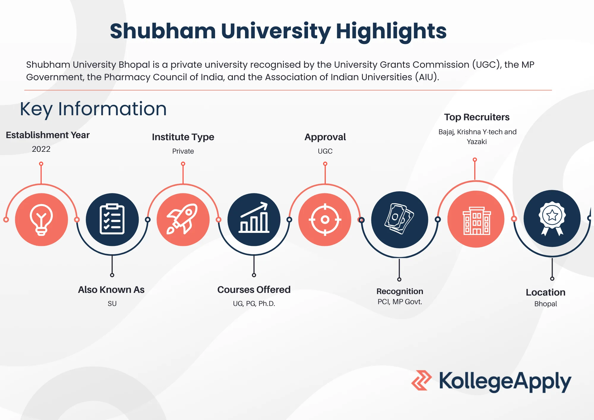 Shubham University Bhopal is a private university recognised by the University Grants Commission (UGC), the MP Government, the Pharmacy Council of India, and the Association of Indian Universities (AIU). Shubham University is a multi-disciplinary institute providing a variety of diplomas, undergraduate, and postgraduate courses in the fields of Engineering, Management, Commerce, Science, Pharmacy, Humanities, and Agriculture. Admission depends on the merit of the qualifying exam results. Shubham University grants scholarships on merit and need. Some of its top recruiters are Bajaj, Krishna Y-tech and Yazaki.