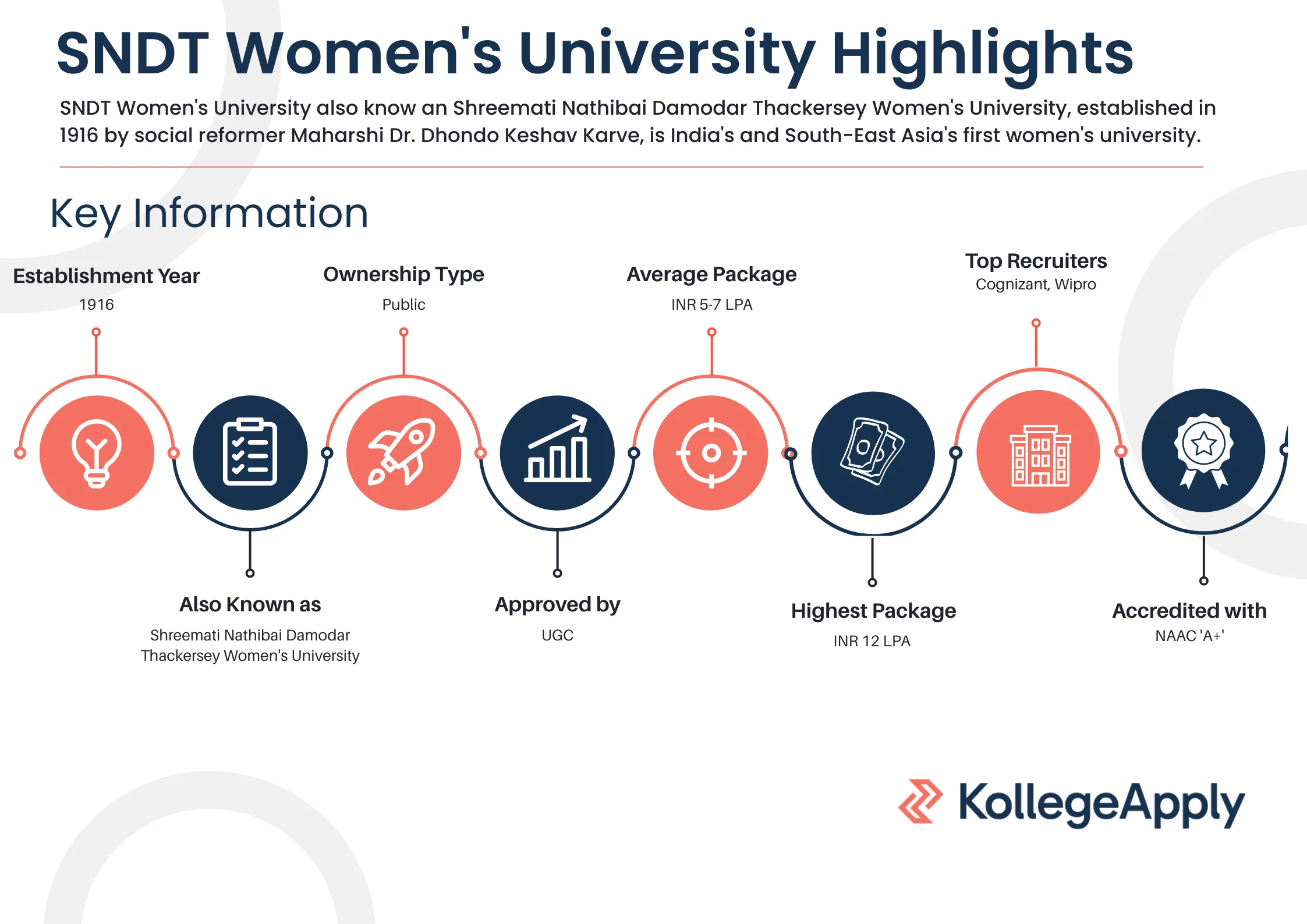SNDT Women's University also know an Shreemati Nathibai Damodar Thackersey Women's University, established in 1916 by social reformer Maharshi Dr. Dhondo Keshav Karve, is India's and South-East Asia's first women's university, dedicated to women's empowerment through education. Re-accredited with NAAC 'A+' grade, it spans three campuses in Mumbai (Churchgate HQ and Juhu) and Pune (Karve Road), offering multidisciplinary UG, PG, diploma, and PhD programs across 39 departments in Arts, Science, Commerce, Technology, Education, Law, and Social Sciences. Affiliated with itself and UGC-approved, it hosts 13 institutions, 307 affiliated colleges, and supports 50,000 students across seven states.