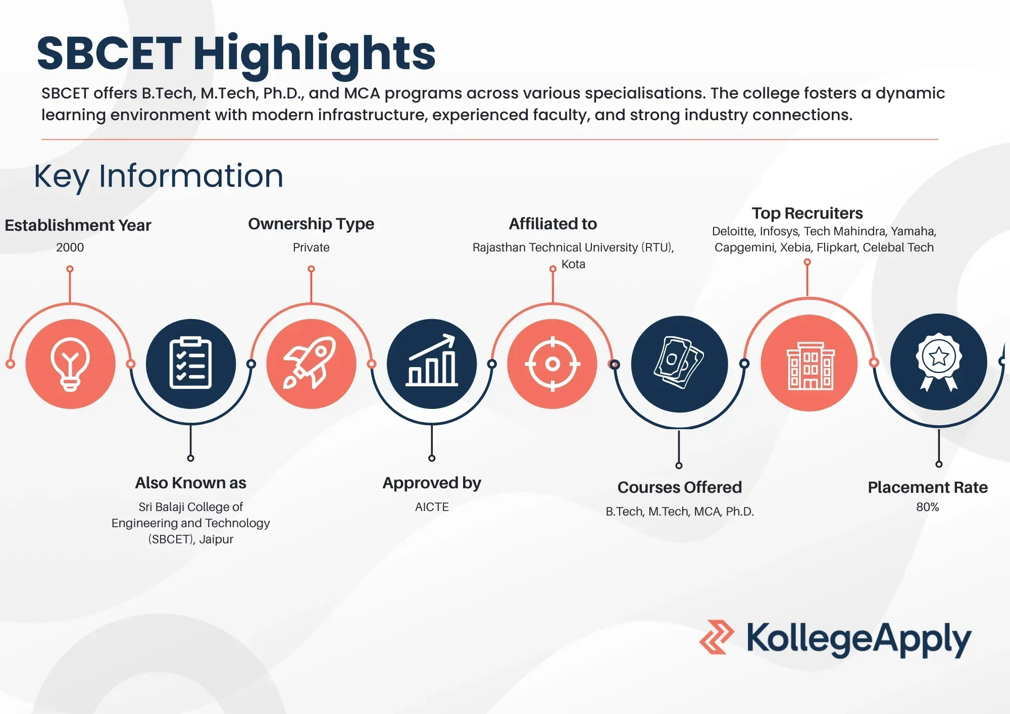 Sri Balaji College of Engineering and Technology (SBCET), Jaipur, established in 2000, is an institution approved by the All India Council for Technical Education (AICTE) and affiliated with Rajasthan Technical University (RTU), Kota. SBCET offers B.Tech, M.Tech, Ph.D., and MCA programs across various specialisations. The college fosters a dynamic learning environment with modern infrastructure, experienced faculty, and strong industry connections, preparing students for successful careers in engineering and technology.