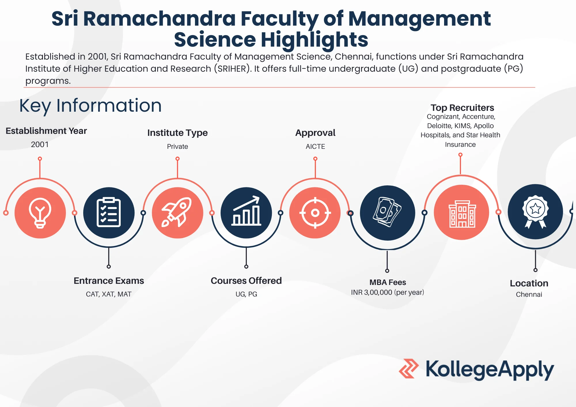Admissions are based on MAT, CMAT, XAT, CAT, ATMA, TANCET or SRIHER Management Aptitude Test scores, followed by a Group Discussion (GD) and Personal Interview (PI). The total fee for the MBA program is approximately INR 6,00,000 for two years. Sri Ramachandra Faculty of Management Science has maintained a strong placement record, with top recruiters including Cognizant, Accenture, Deloitte, KIMS, Apollo Hospitals, and Star Health Insurance.