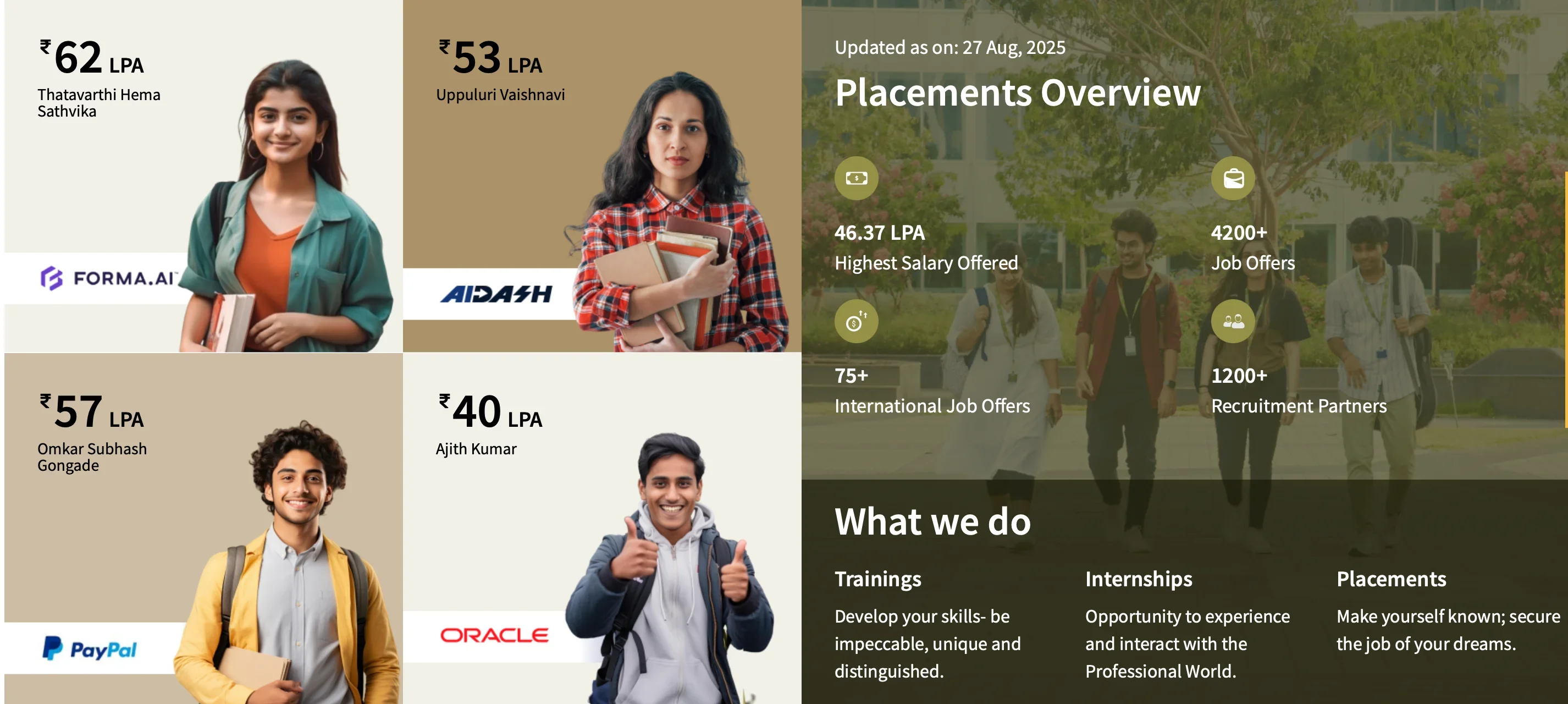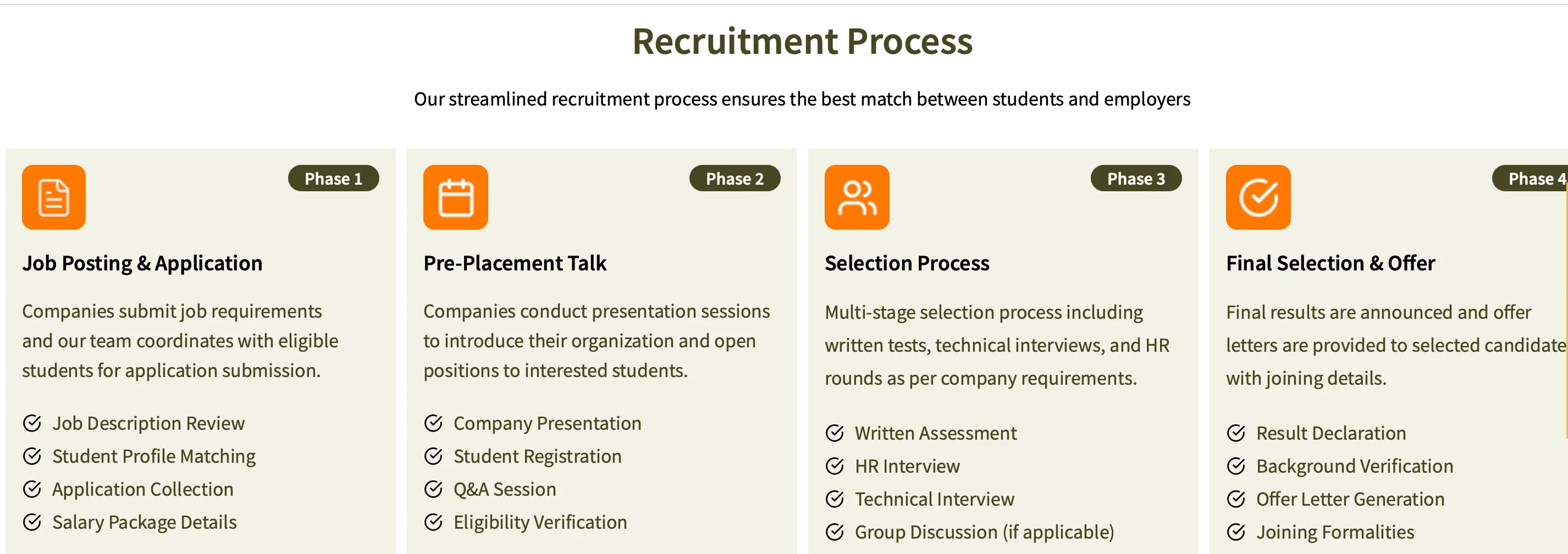 - Campus Recruitment Drives: Conducted by national and global companies through written tests, group discussions, and interviews.