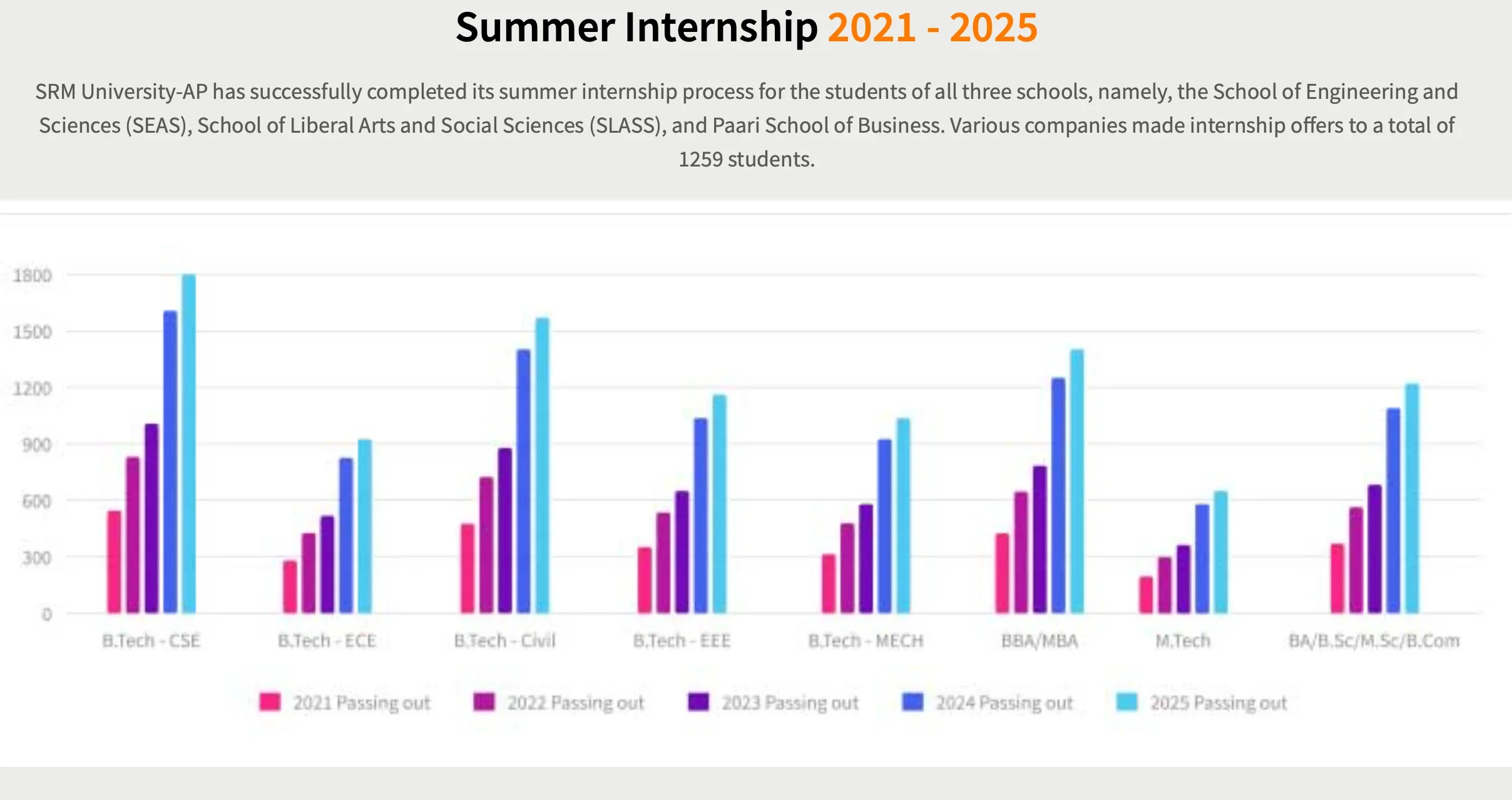 In 2024-25, SRM University AP placement cell achieved highest package of INR 46.37 LPA with top recruiters such as Google, Amazon, Oracle, IBM, ARM, and Adobe, while the average package stood at INR 7.07 LPA. SRM University also offer internship opportunities to undergraduates as well as to master students. The total company visited in academic year 2025 was 393 with more than 700 student placed