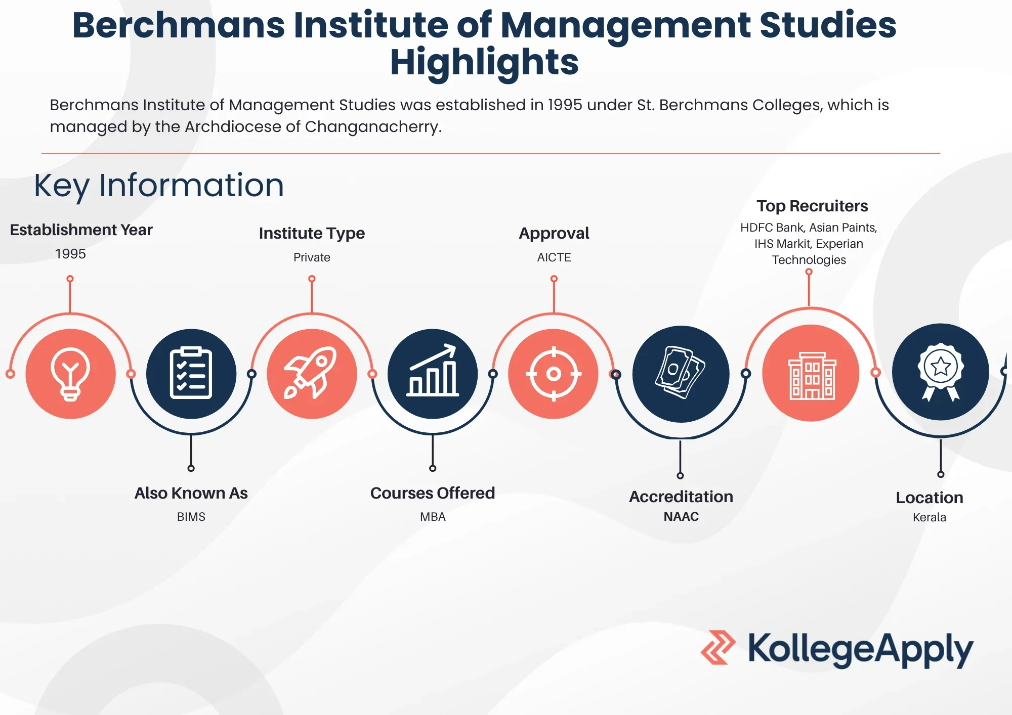Berchmans Institute of Management Studies was established in 1995 under St. Berchmans Colleges, which is managed by the Archdiocese of Changanacherry. The institute has been offering an MBA program for the last 27 years. It has completed 26 MBA degree batches. It is also approved by the All India Council of Technical Education (AICTE) and affiliated with the Mahatma Gandhi University, Kottayam.