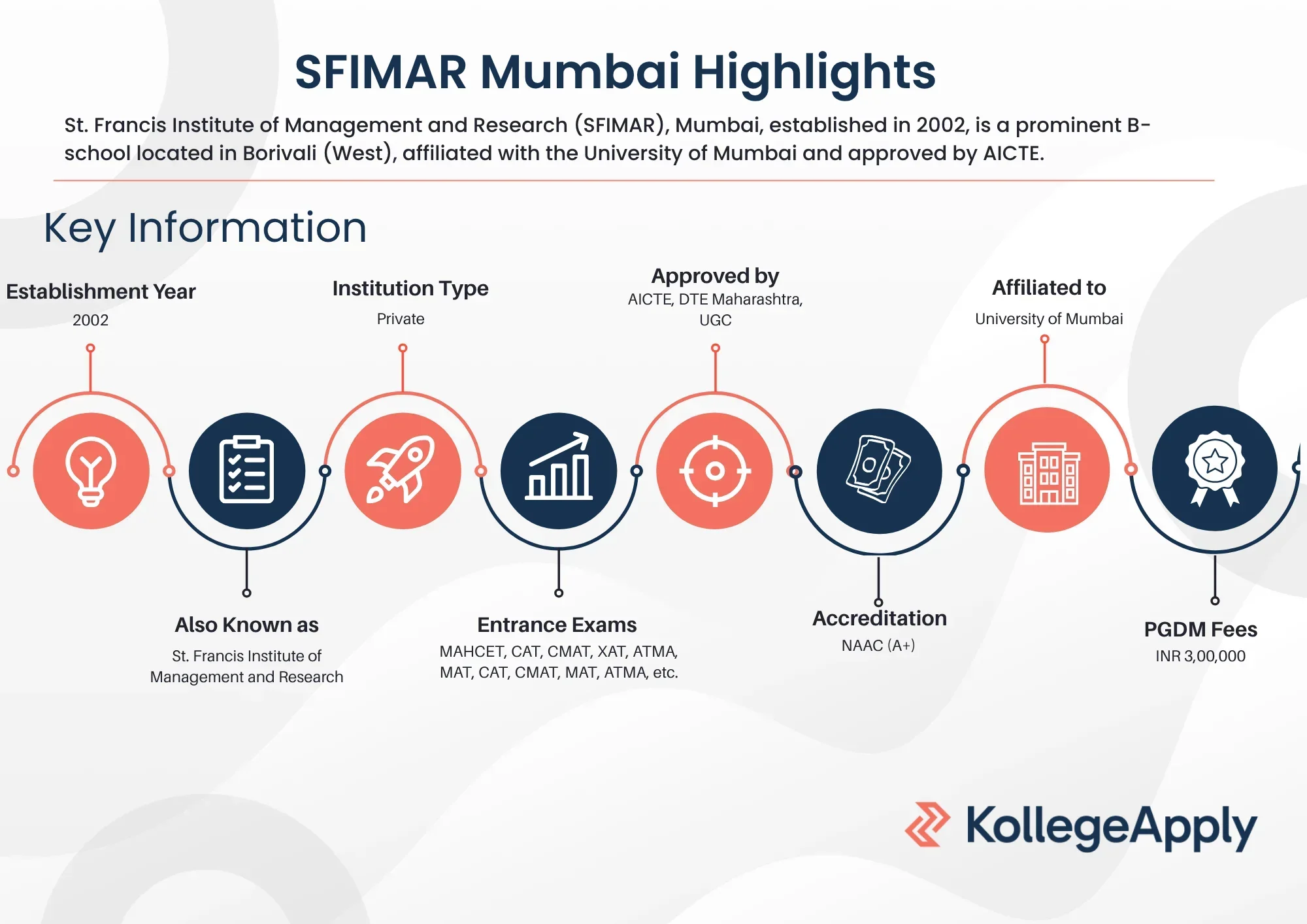 St. Francis Institute of Management and Research (SFIMAR), Mumbai, established in 2002, is a prominent B-school located in Borivali (West), affiliated with the University of Mumbai and approved by AICTE. The institute offers a range of management programmes, including the flagship Master of Management Studies (MMS), AICTE-approved Post Graduate Diploma in Management (PGDM), Bachelor of Management Studies (BMS), and a doctoral programme (Ph.D.) in Management. SFIMAR holds NAAC ‘A+’ accreditation and is also ISO 9001:2015 certified, reflecting its commitment to quality education and institutional excellence.